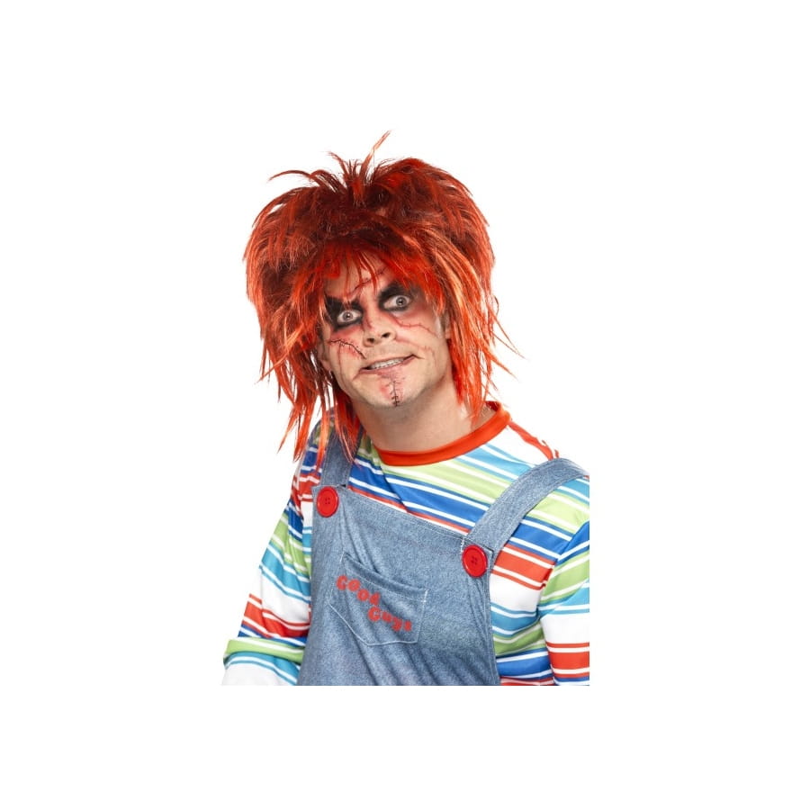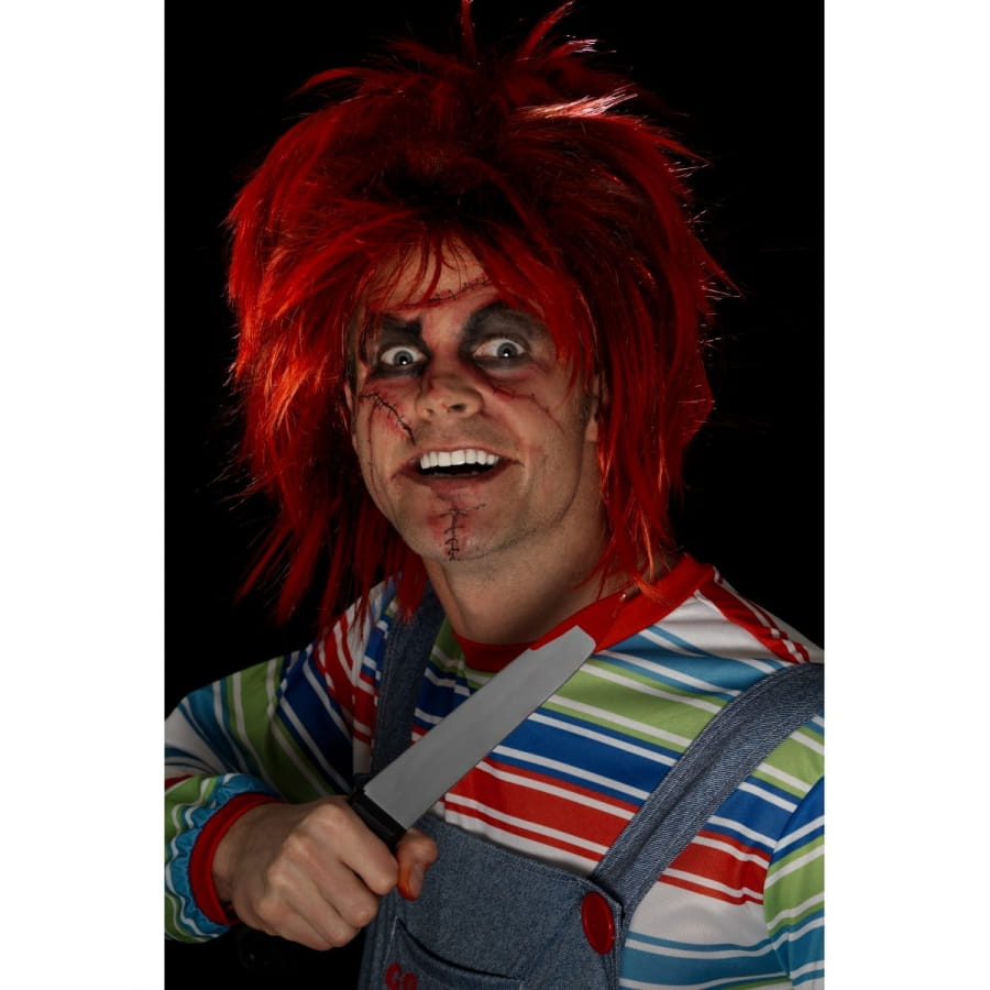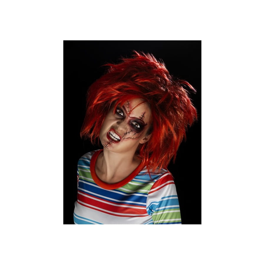 Pour peaufiner votre déguisement de chucky, ce kit de maquillage chucky est ce qu'il vous faut. Ce maquillage de couleur rouge et noir avec brosse et tatouage pour adulte convient aux hommes comme aux femmes.