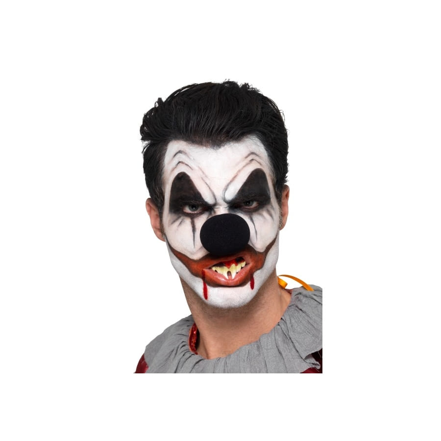 L'ensemble est composé de trois teintes de peinture à l'eau, dont le blanc, le noir et le rouge, ainsi que d'un nez noir, de fausses dents et des outils pour l'application de votre déguisement, à savoir une éponge et une brosse.