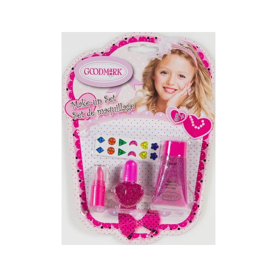 Il s'agit d'un gel pailleté rose, un vernis à ongles rose, du rouge à lèvres rose ainsi que 6 boucles autocollantes.