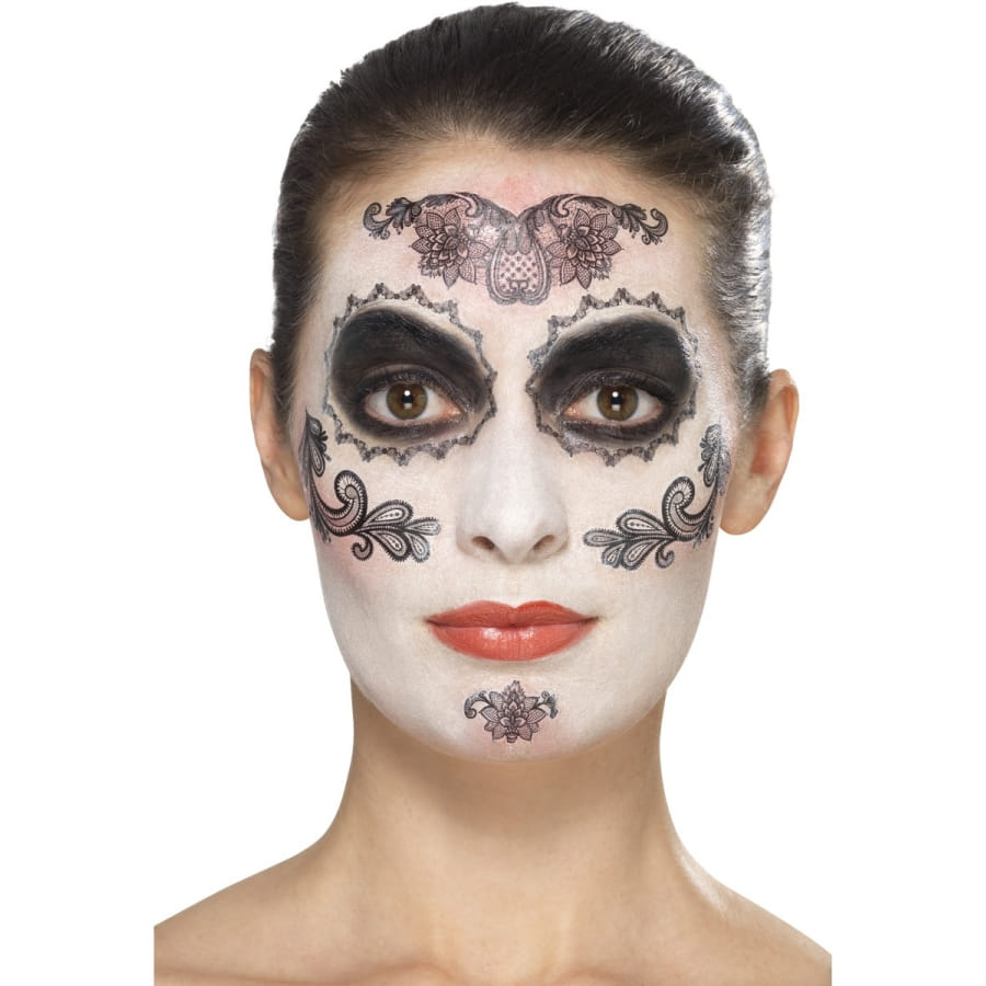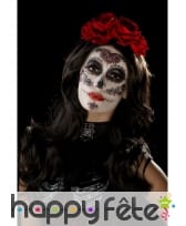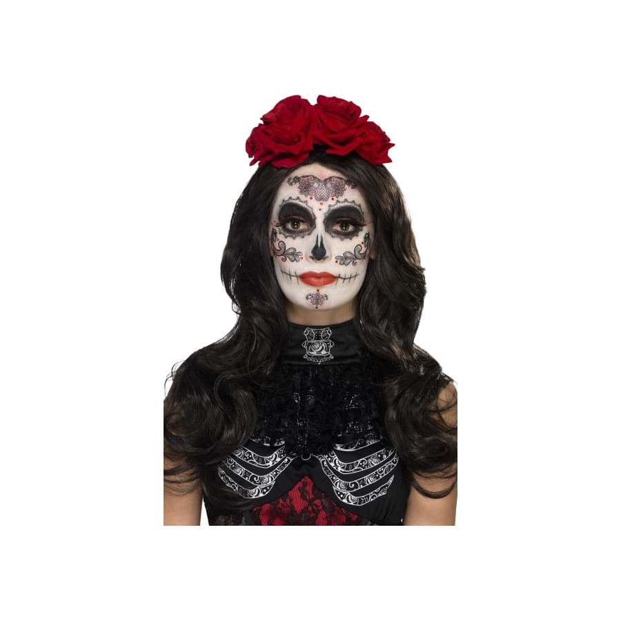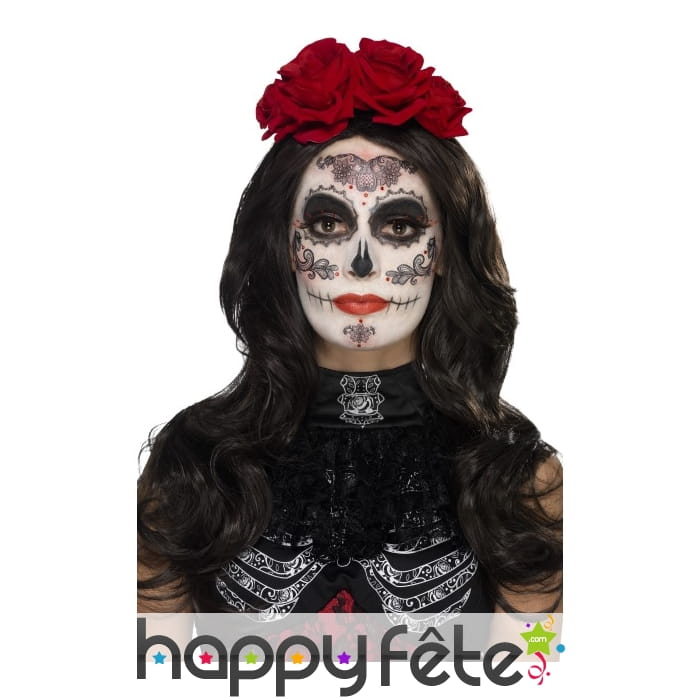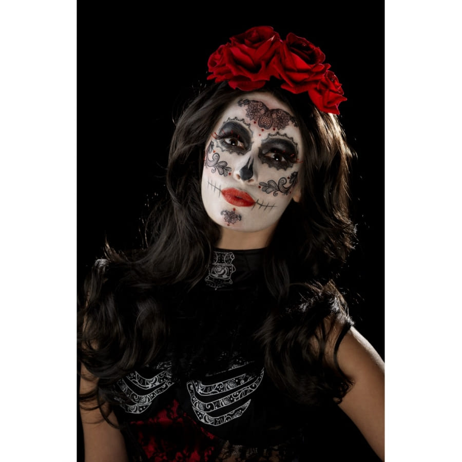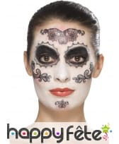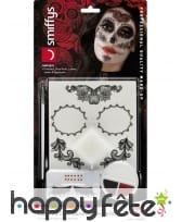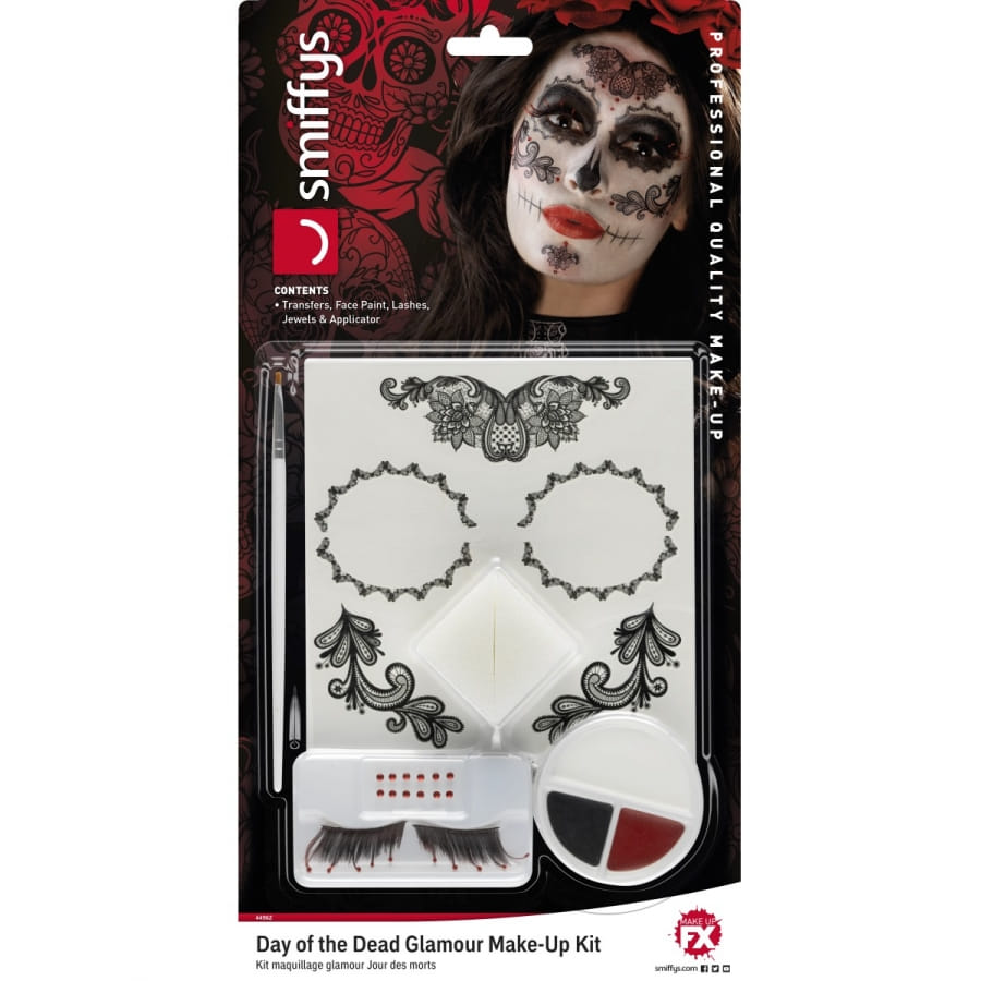 Inspirez-vous de la célébration du jour des morts au Mexique pour constituer votre déguisement d'Halloween. Pour vous faciliter la tâche, munissez-vous du kit de maquillage jour des morts glamour. Il comprend plusieurs éléments de couleur blanche et noire, indispensables pour constituer un look glamour d'Halloween. Vous disposerez de transferts à motif floral, de peinture pour visage, de faux cils, de petits bijoux de maquillage et d'un applicateur.