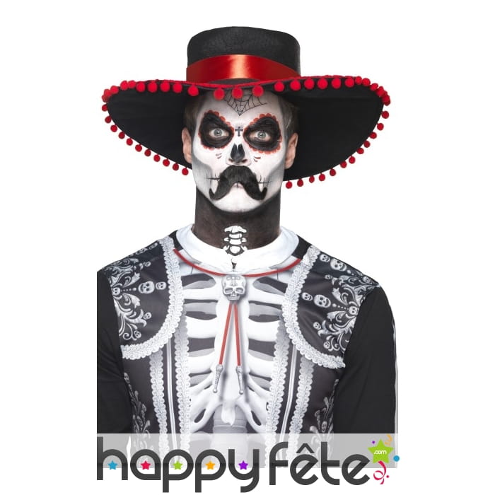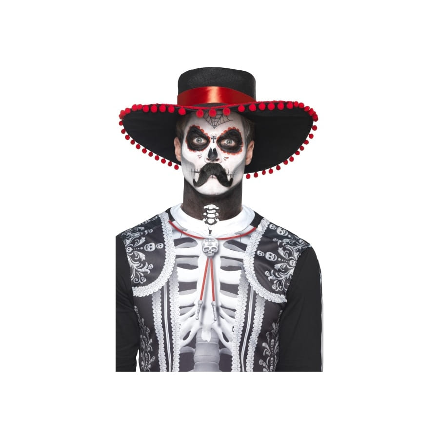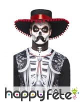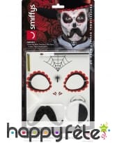 Halloween approche, disposez de toute l'armada nécessaire pour vous métamorphoser en seigneur mexicain. Le kit de maquillage jour des morts pour homme vous rendra digne de la tradition mexicaine. Le kit comprend des éléments de couleur blanche et noire : des transferts en forme de toile d'araignée, de petite croix, etc ; de la peinture pour visage ; un crayon ; des applicateurs et une moustache.
