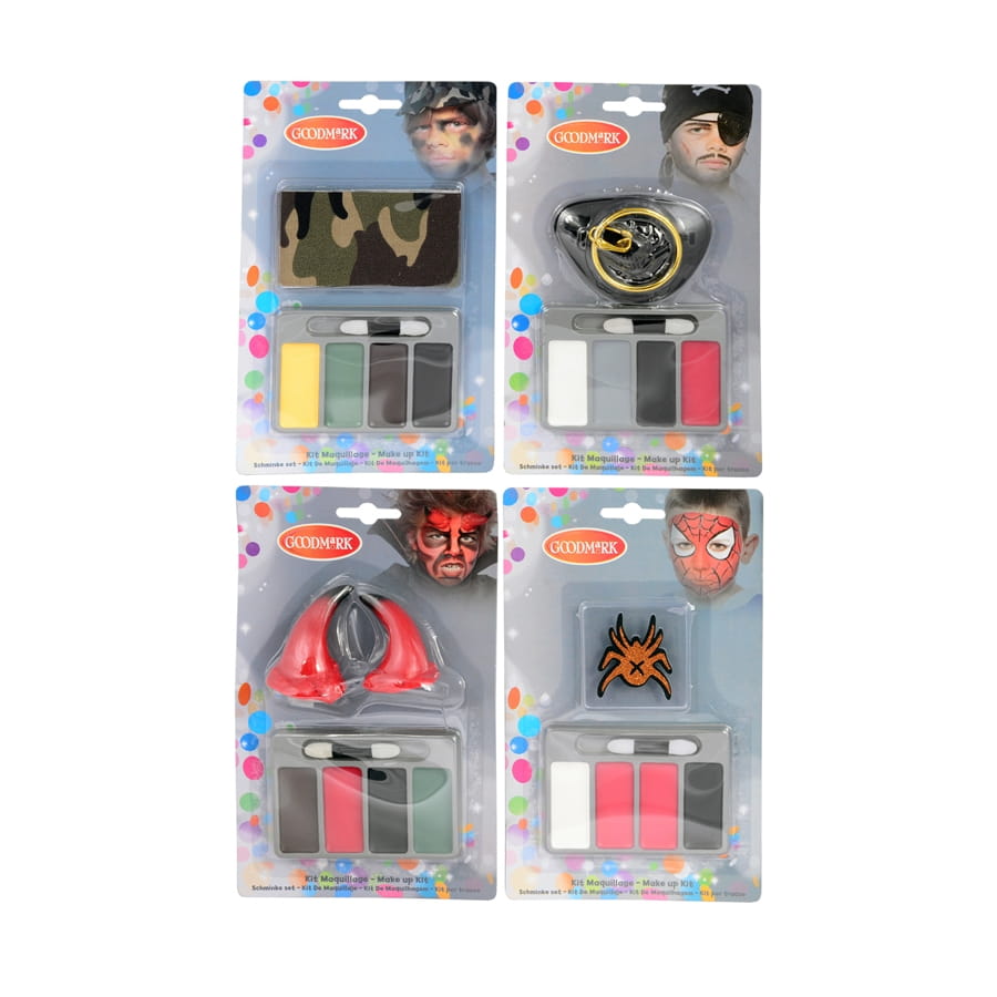Maquillez votre petit garçon pour que son déguisement soit plus que réussi. Nous proposons un kit de maquillage pour garçon décliné en différents personnage : pirate, Spiderman, X-men ou soldat. Ce kit vous sera très utile pour une fête d'anniversaire ou une simple fête costumée pour enfants. Vendu à l'unité, ce kit est décliné en plusieurs modèles, il est possible de choisir le modèle ou de choisir "assortit", en choisissant cela, vous recevrez un kit pris au hasard parmi ceux en stock.