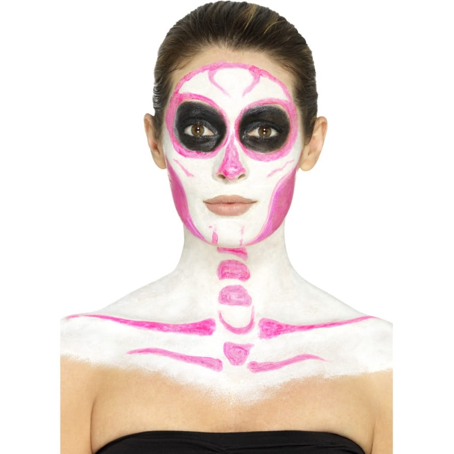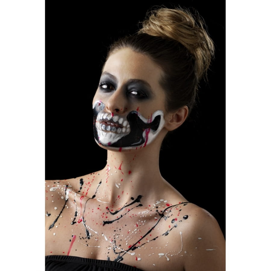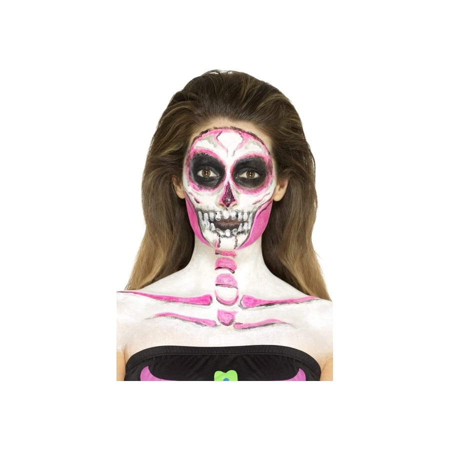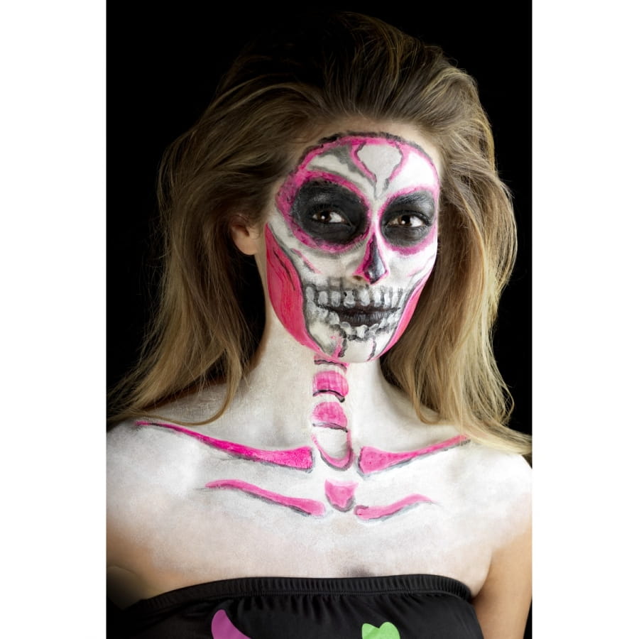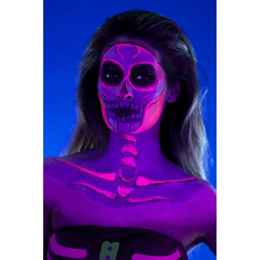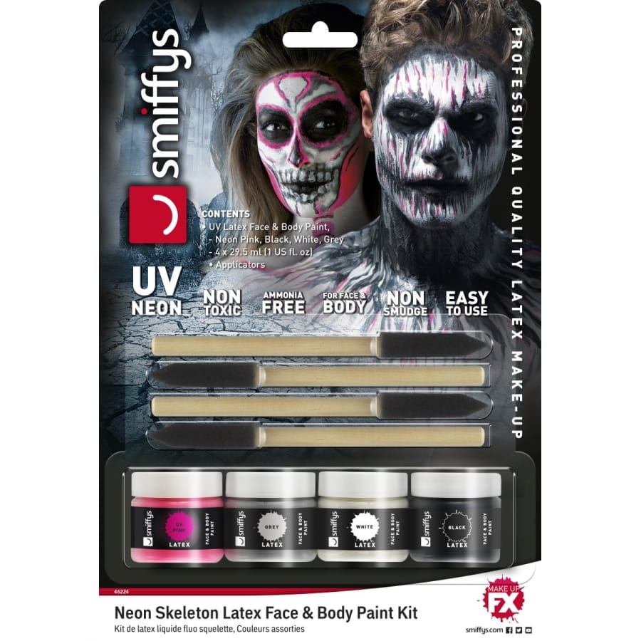 Faire en sorte qu'un squelette reprenne vie sera une véritable partie de plaisir pour Halloween. Vous avez l'occasion de faire briller un squelette dans le noir grâce à cet article cosmétique. Équipez-vous tout simplement du kit de maquillage squelette néon, réagit aux UV. Vous utiliserez un produit à base de latex liquide et qui réagit aux ultraviolets. Vous disposerez de 4 pots de 29,57 ml chacun, contenant du maquillage phosphorescent de différentes couleurs. Pour l'application, 4 éponges vous seront fournies.
