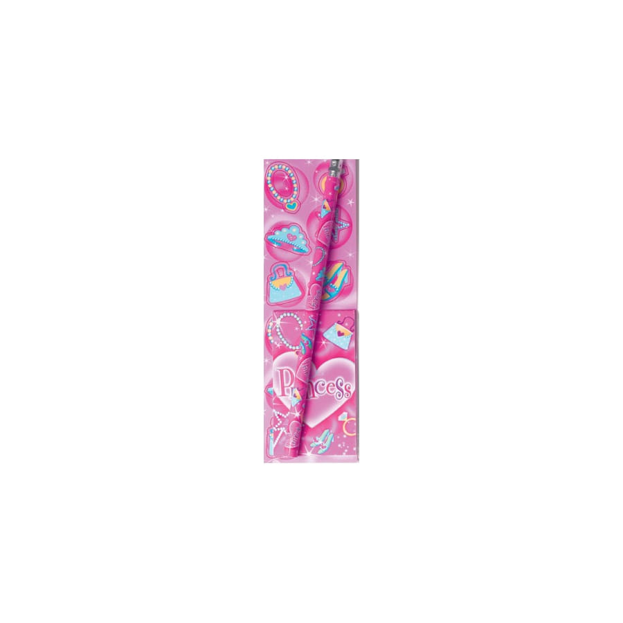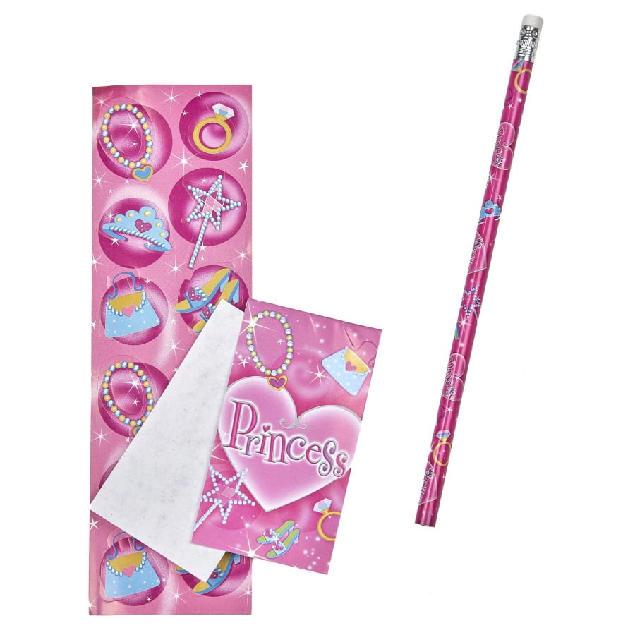 L'article comprend un bloc-notes rose, un crayon à papier rose équipé d'une gomme et une plaquette de 12 petits autocollants sur le thème princesse.