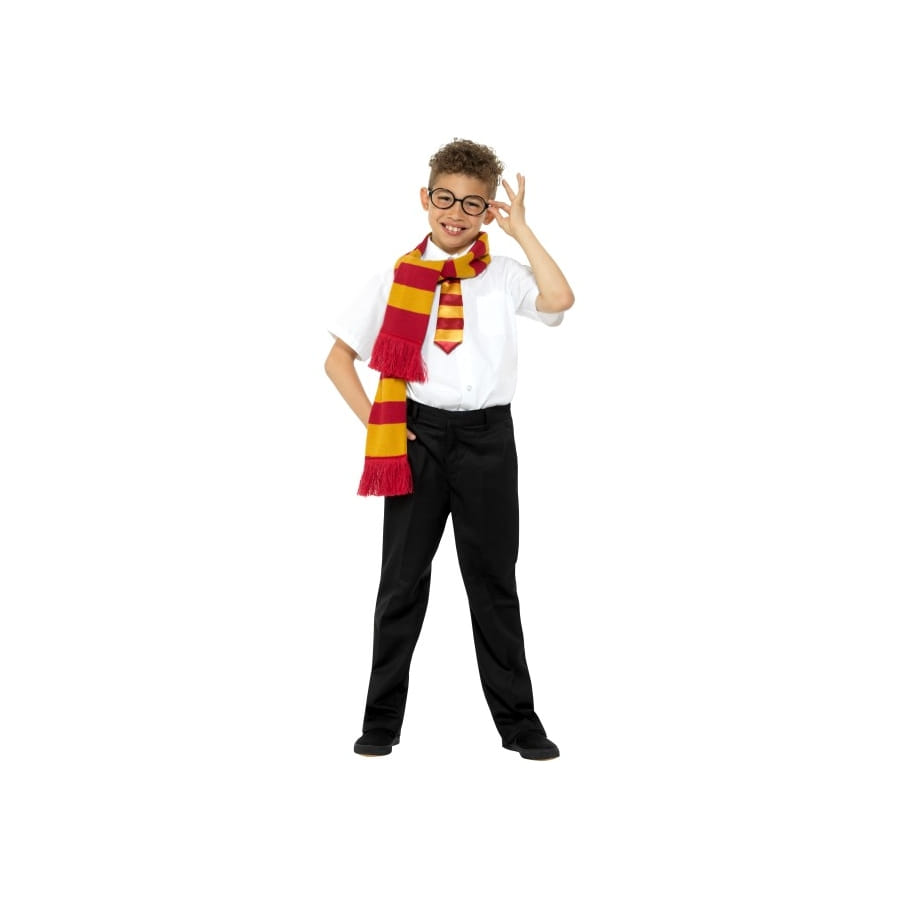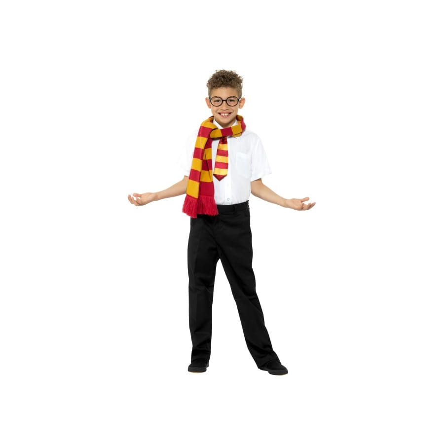 La sonnerie retentit de bon matin, il faut vite se presser pour entrer en classe ! Offrez à votre enfant un look de premier de la classe grâce à ce kit de petit écolier. Il s'agit tout d'abord d'une écharpe à rayures rouges et jaunes accompagnée d'une petite cravate de couleur assortie. L'article est également composé d'une paire de lunettes à monture ronde. Cette panoplie est adaptée aux petites filles comme aux petits garçons. Puisque le lot comporte une cravate, l'idéal serait de porter une chemise blanche avec une jupe pour les filles et un pantalon pour les garçons. Ainsi, vous disposerez d'un véritable uniforme d'écolier !