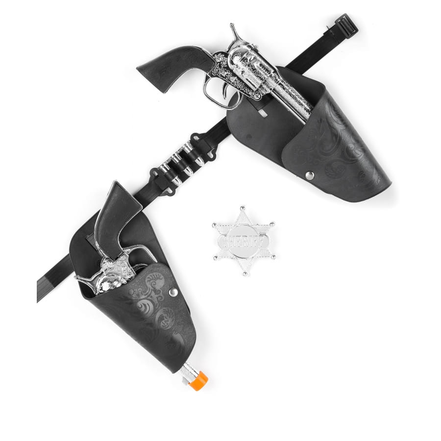 Le set comporte trois balles, deux pistolets argentés, une lanière mesurant environ 73,5 cm, une étoile de shérif ainsi que des étuis de 15 cm pour ranger les armes.