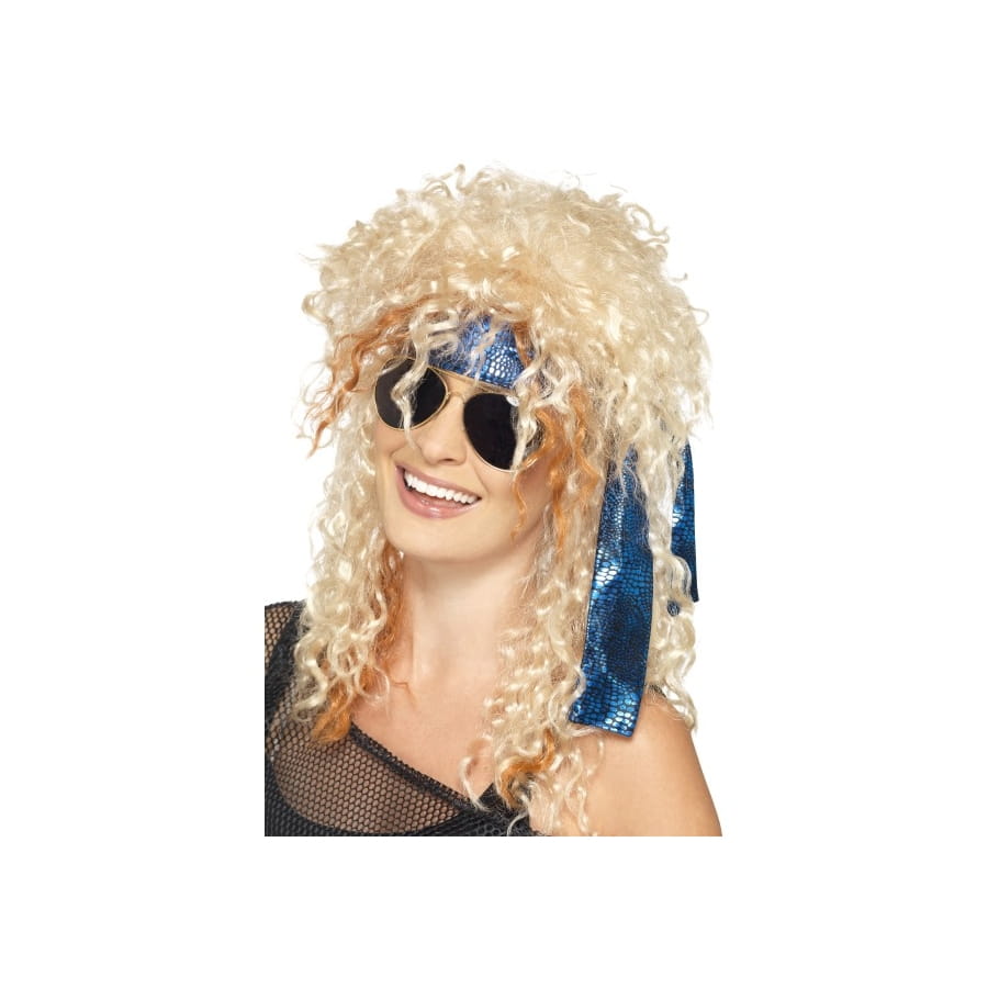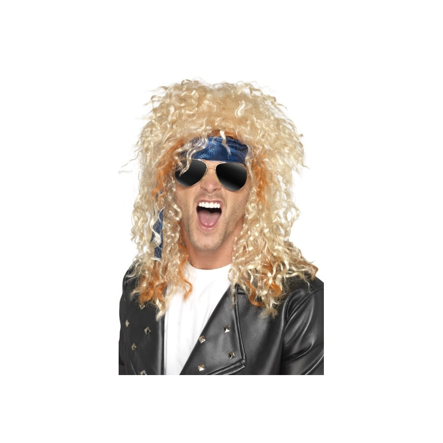 Lors d'un carnaval ou d'une fête déguisée, voici un kit de rocker heavy métal qui vous permettra de vous déguiser en rockeur heavy métal des années 70 ou 80. L'ensemble est composé d'une perruque blonde frisée, d'un bandana en satin bleu roi et d'une paire de lunettes de soleil noires emballés dans un carton. Cet article est destiné aux hommes.