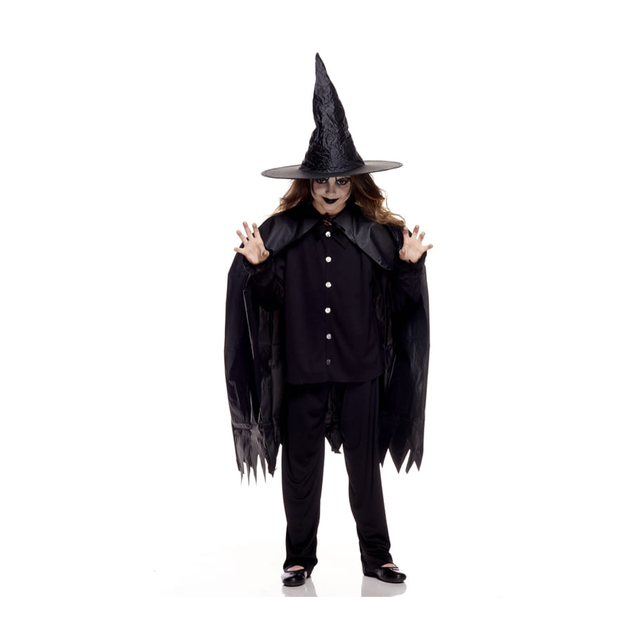 Goûtez à la magie du déguisement pour Halloween ! Ce kit de sorcière noire pour enfant vous prouvera que vous n'avez pas forcément besoin d'un attirail complet pour opérer une transformation. Ce modèle simple, authentique et efficace a été conçu pour les jeunes demoiselles. Vous disposerez d'une cape et d'un chapeau, tous deux fournis dans la couleur noire. Les bords de la cape affichent une allure déchiquetée. Quant au chapeau, il s'agit du modèle typique réservé aux sorcières : large à la base et très pointu au sommet. Associez ce set de sorcière à une tenue de couleur noire, et vous décrocherez un déguisement adéquat pour fêter Halloween en toute beauté !