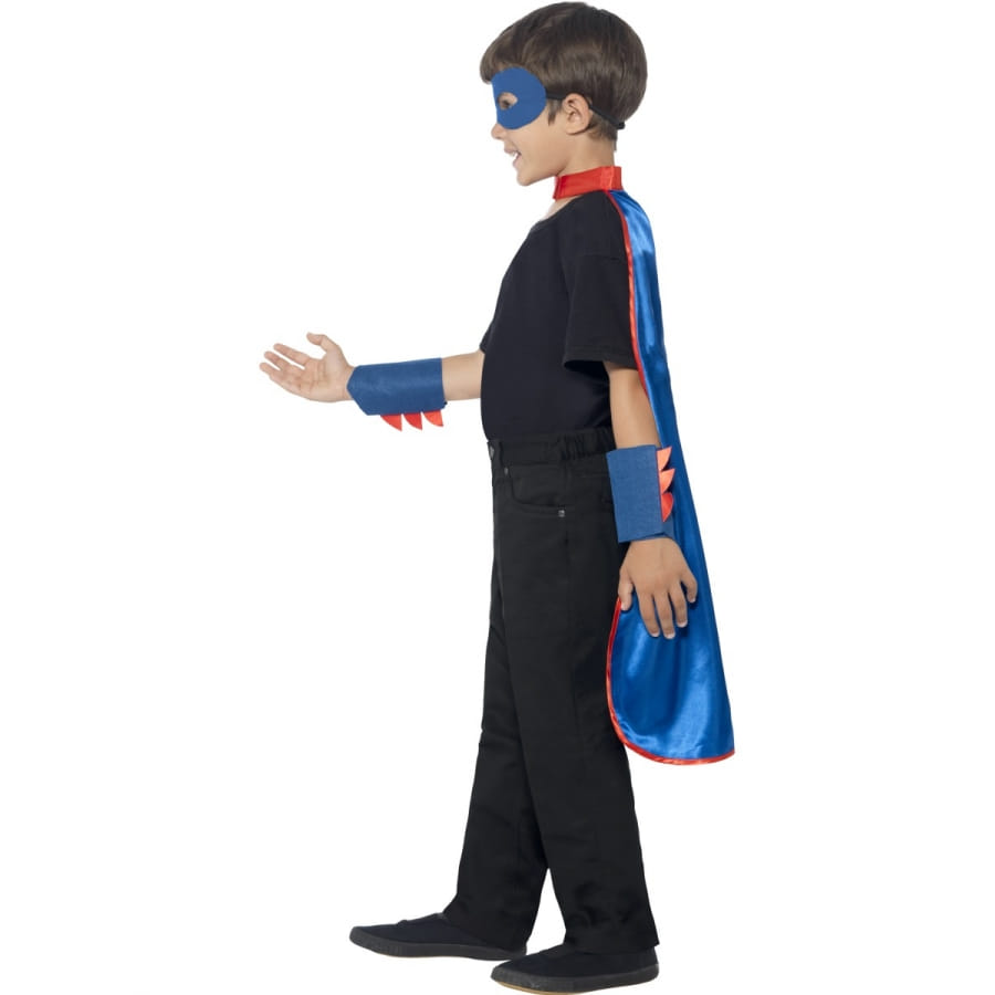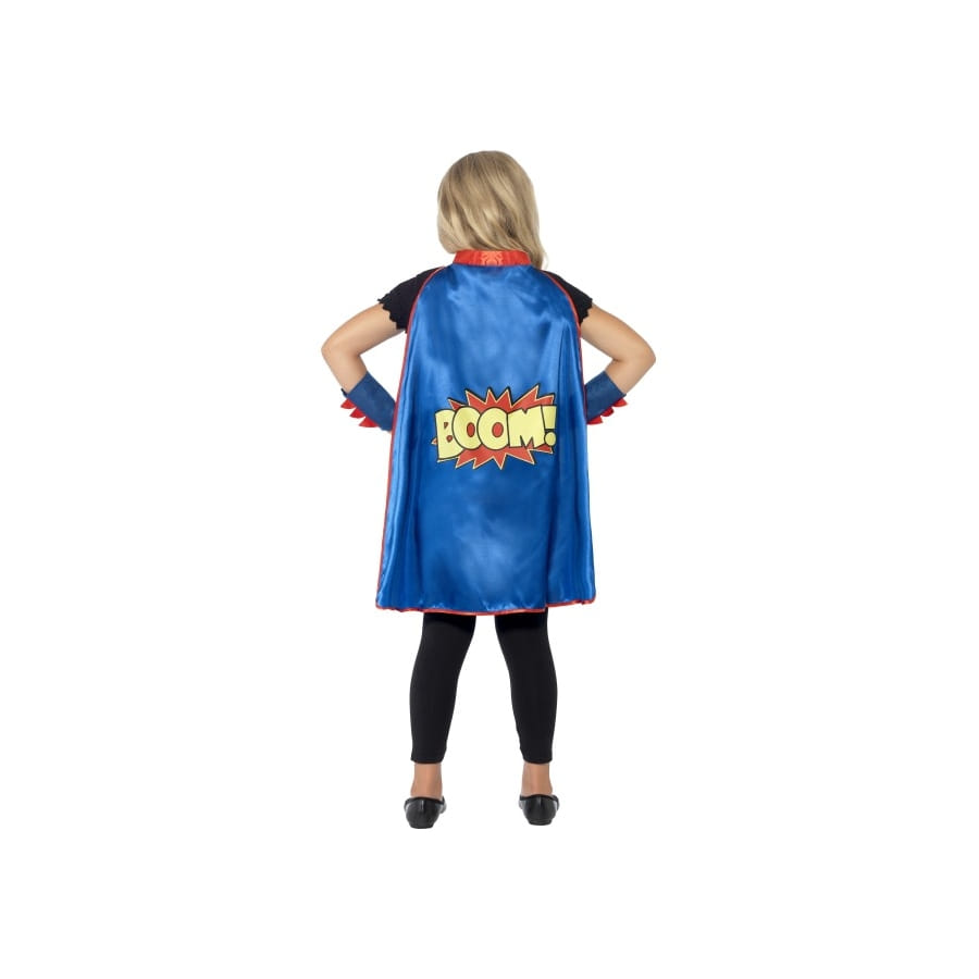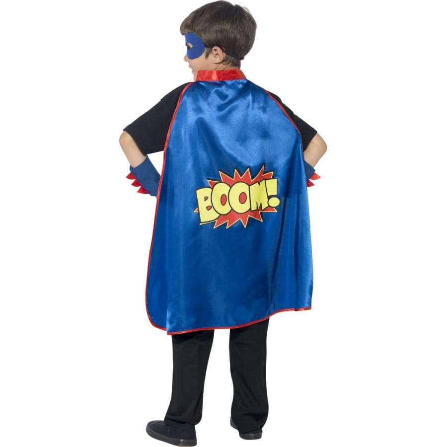 Faites de votre petit garçon (ou de votre petite fille) le super-héros qu'il a toujours rêvé d'être avec ce kit de déguisement de super-héros pour enfant, disponible en taille unique. Ce kit comprend une cape, un masque et des bracelets. L'ensemble est de couleur bleue et rouge avec une écriture en grand caractère derrière le dos, de couleur jaune, et qui porte l'inscription : « BOOM ! ». C'est le son de l'impact de son arrivée auprès de ses amis, qui seront vert de jalousie en voyant qu'il est LE super-héros de la fête. Votre enfant aura le sourire jusqu'aux oreilles en se voyant porter ces accessoires. Le plus dur sera d'arriver à les lui enlever.