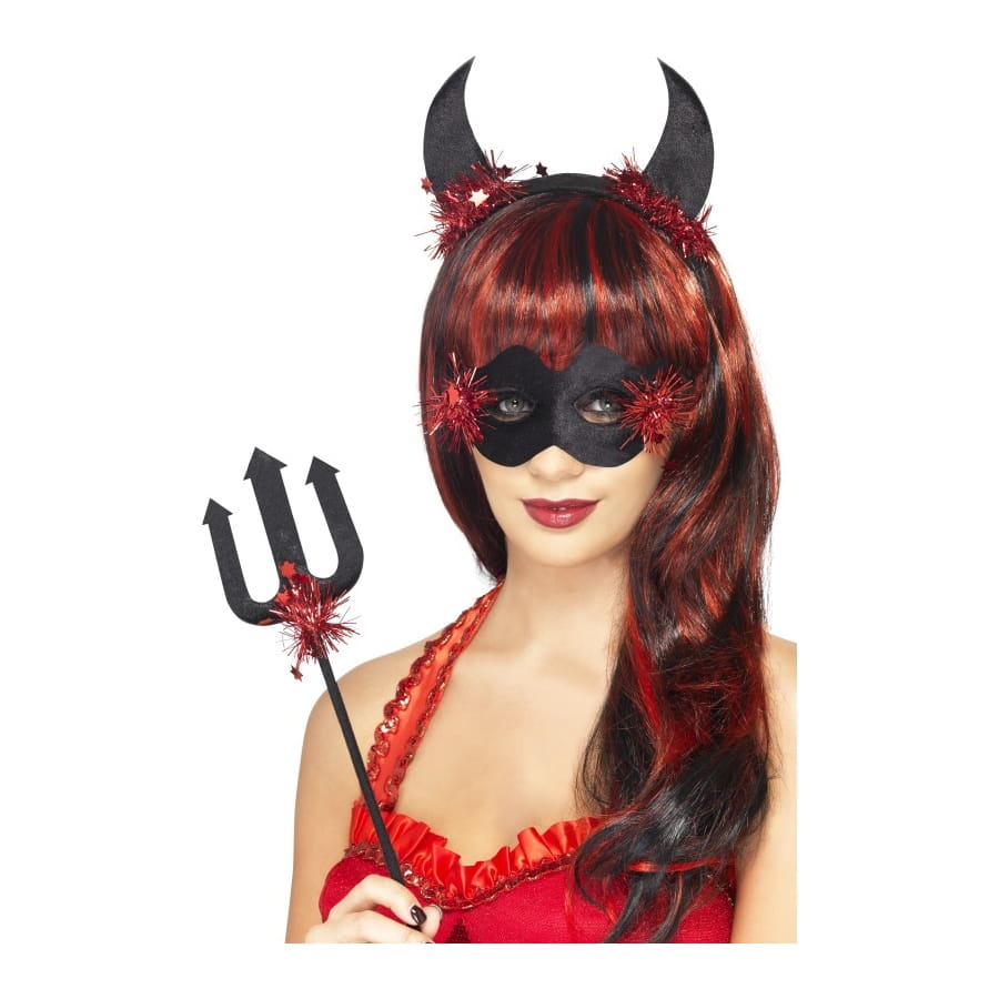 Kit de diablesse de couleur noire et rouge, pour femme, composé d'un masque, de cornes et d'un mini-trident. Les 3 accessoires sont de couleur noire et ornés de petites franges métalliques rouges. Il suffit d'un set comme celui-ci pour compléter un déguisement de diablesse.