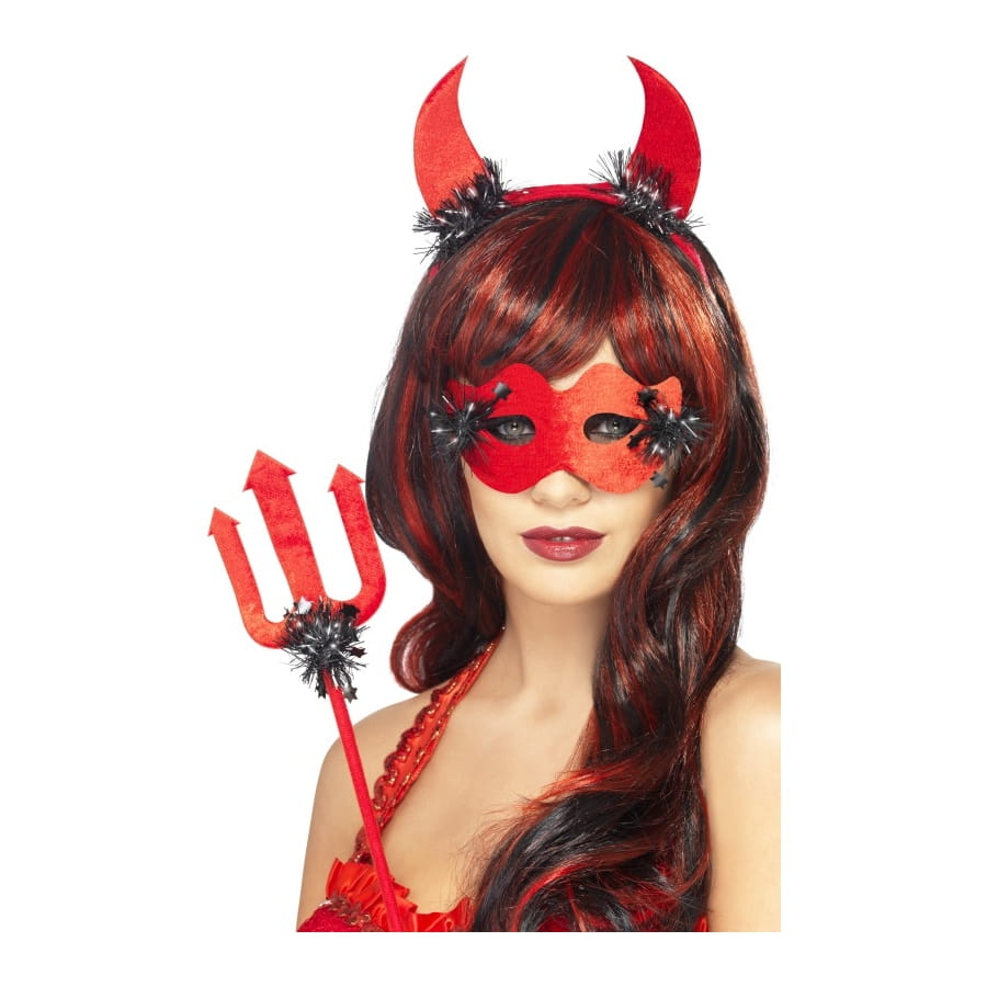 Kit de diablesse de couleur rouge, pour femme ou adolescente, composé d'un masque, d'un trident et d'une paire de cornes. Chaque accessoire est agrémenté de paillettes noires et les cornes sont montées sur un serre-tête. C'est un déguisement parfait pour Halloween.