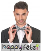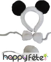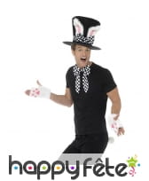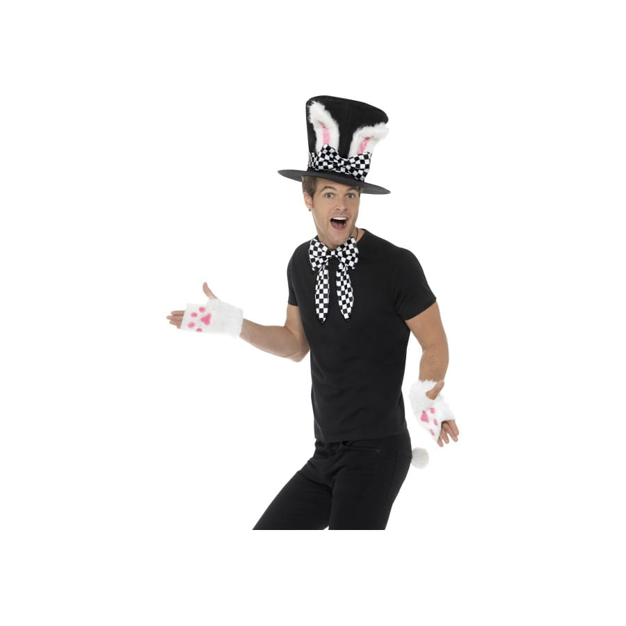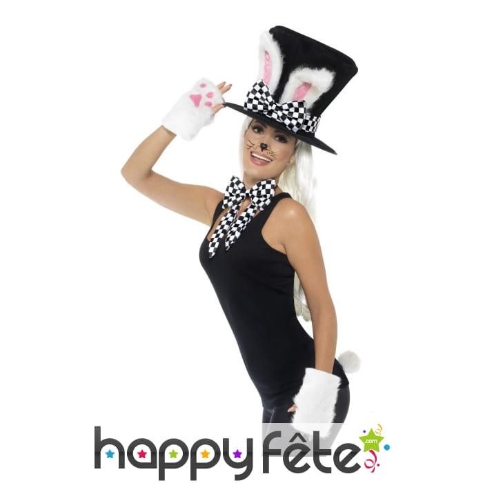 Le set comprend un chapeau haut de forme noir avec un gros noeud à pois blanc et noirs sur le devant, des petites oreilles blanches et roses à placer sur le chapeau, un noeud papillon assorti au noeud du chapeau, une paire de gants assorti aux oreilles, et enfin une queue.