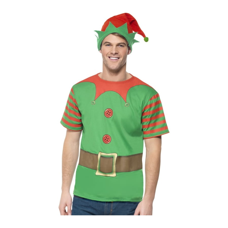 Déguisement d'elfe pour homme composé d'un T-shirt imprimé avec des motifs de boutons rouges et d'une ceinture marron. Le déguisement est également fourni avec un chapeau d'elfe à pompon rouge et vert.
