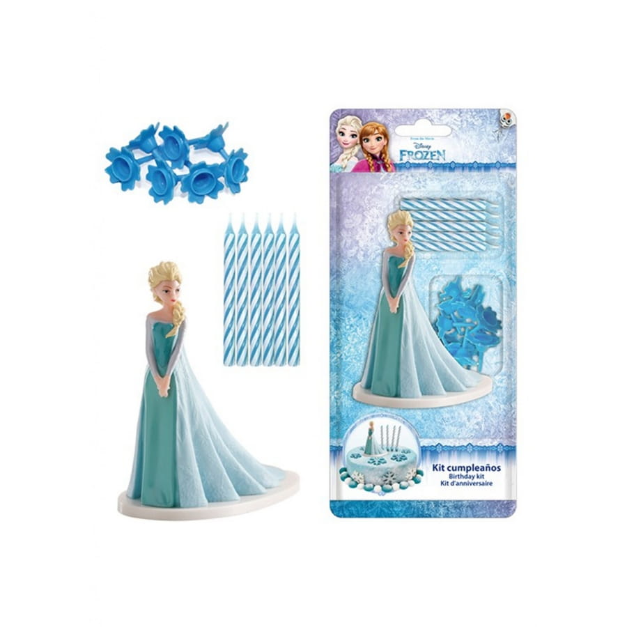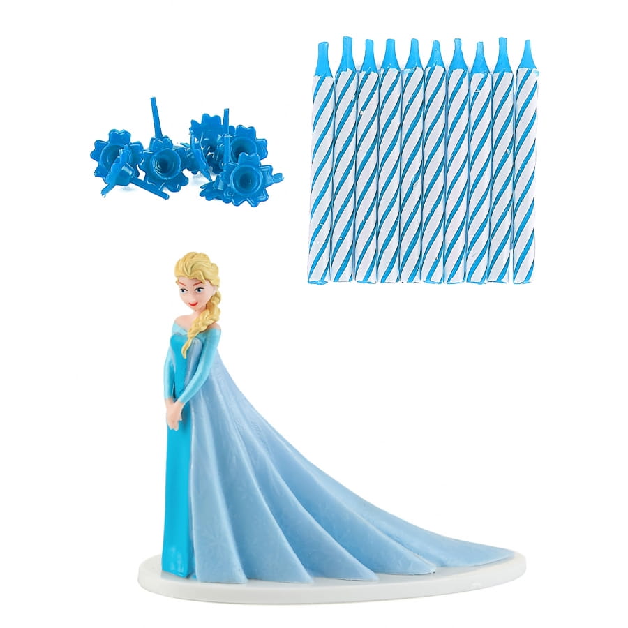 C'est un assemblage constitué de: une figurine en plastique à l'effigie d'Elsa en longue robe bleue, 10 bougies d'anniversaire et 10 bobèches en plastique.