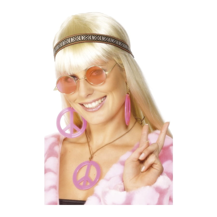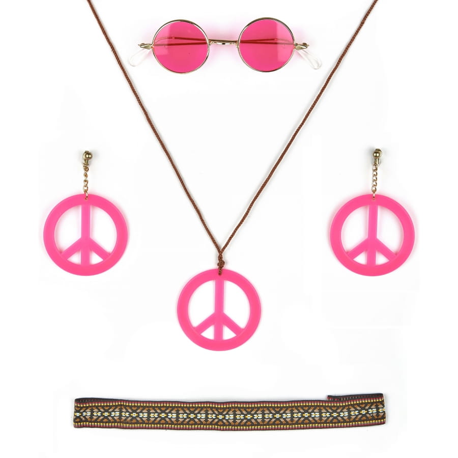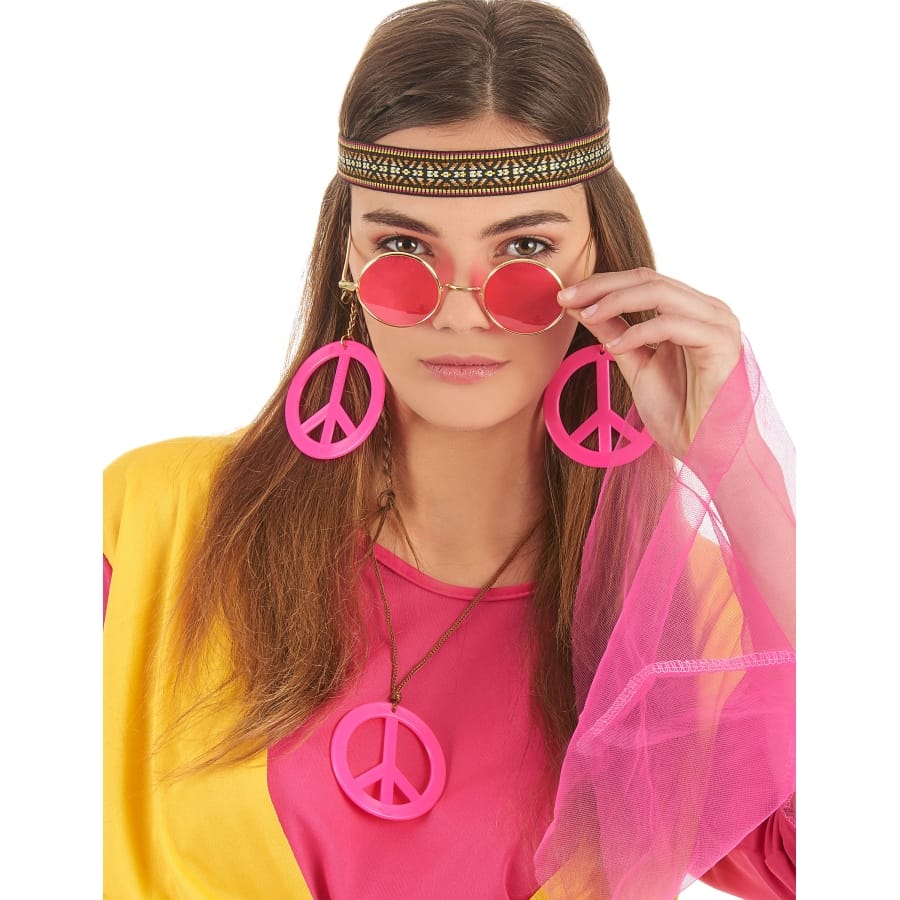 Vous voulez vous déguisé en hippie pourquoi ne pas compléter votre déguisement avec ce kit de hippie pour femme. Il est composé d'un serre-tête, de lunette ronde de couleur rose, de bijoux tel que des boucles d'oreilles rose et d'un collier rose.