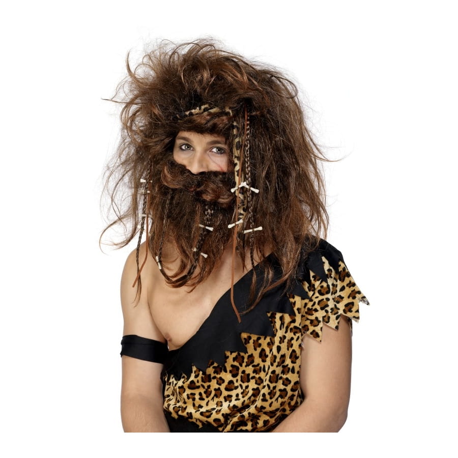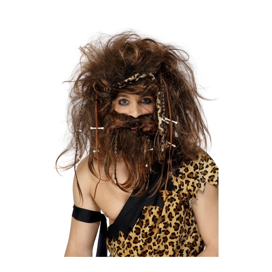 Kit d'homme des cavernes, pour homme ou adolescent, composé d'une perruque et d'une barbe. Les deux sont de couleur châtain, avec de petites tresses ornées de petits os. Cet ensemble vous transformera instantanément en homme de l'Age de Pierre!