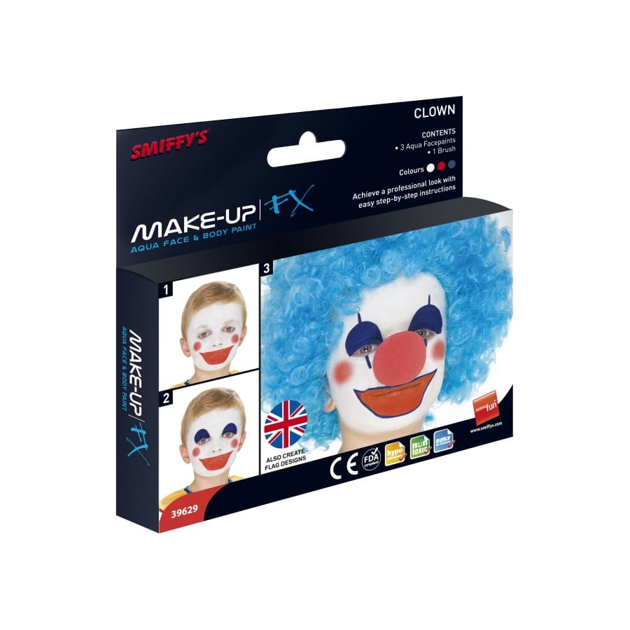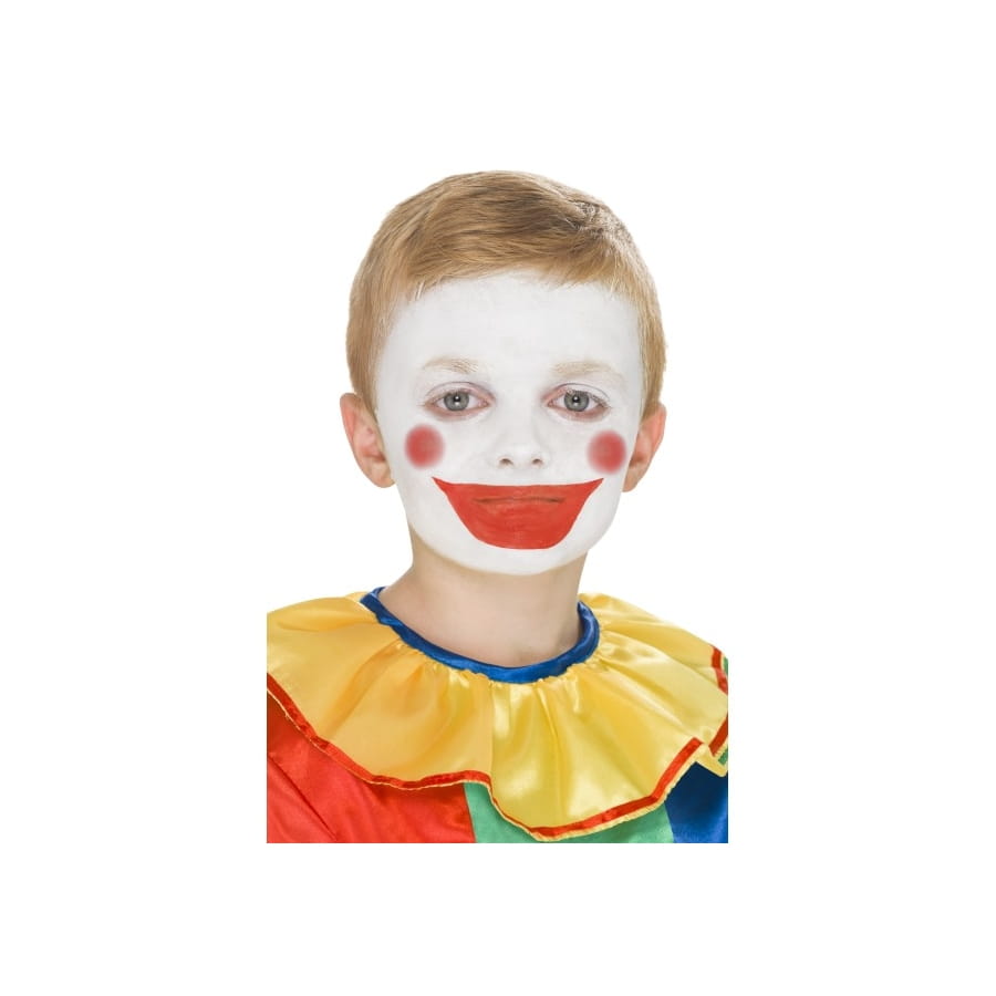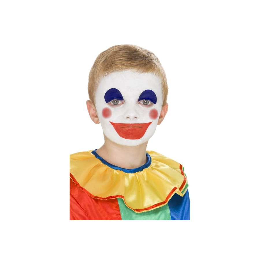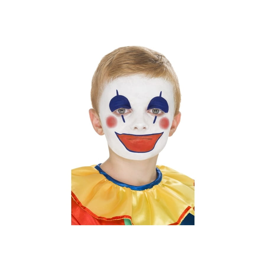 Vous vous déguisez en clown vous devrez avoir le maquillage pour compléter votre déguisement de clown. Ce kit de maquillage pour clown est composé de trois couleurs blanc, bleu et rouge ainsi qu'une brosse et un guide pas à pas.