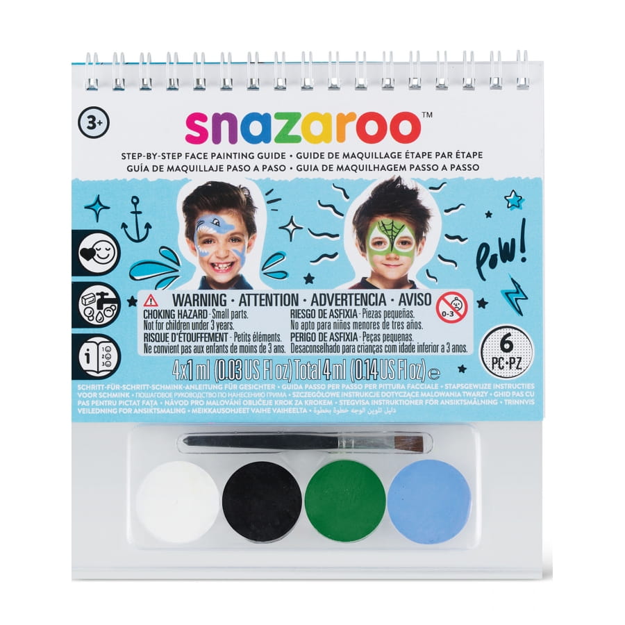 Pour que votre petit trésor soit le plus beau et plus original pendant un carnaval, spectacle d'école, une fête déguisée ou un goûter d'anniversaire, nous vous proposons ce kit maquillage garçon avec livret, Snazaroo.