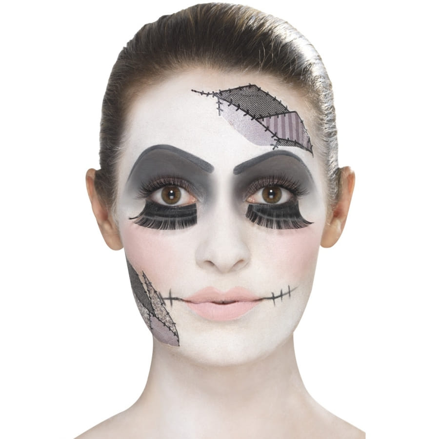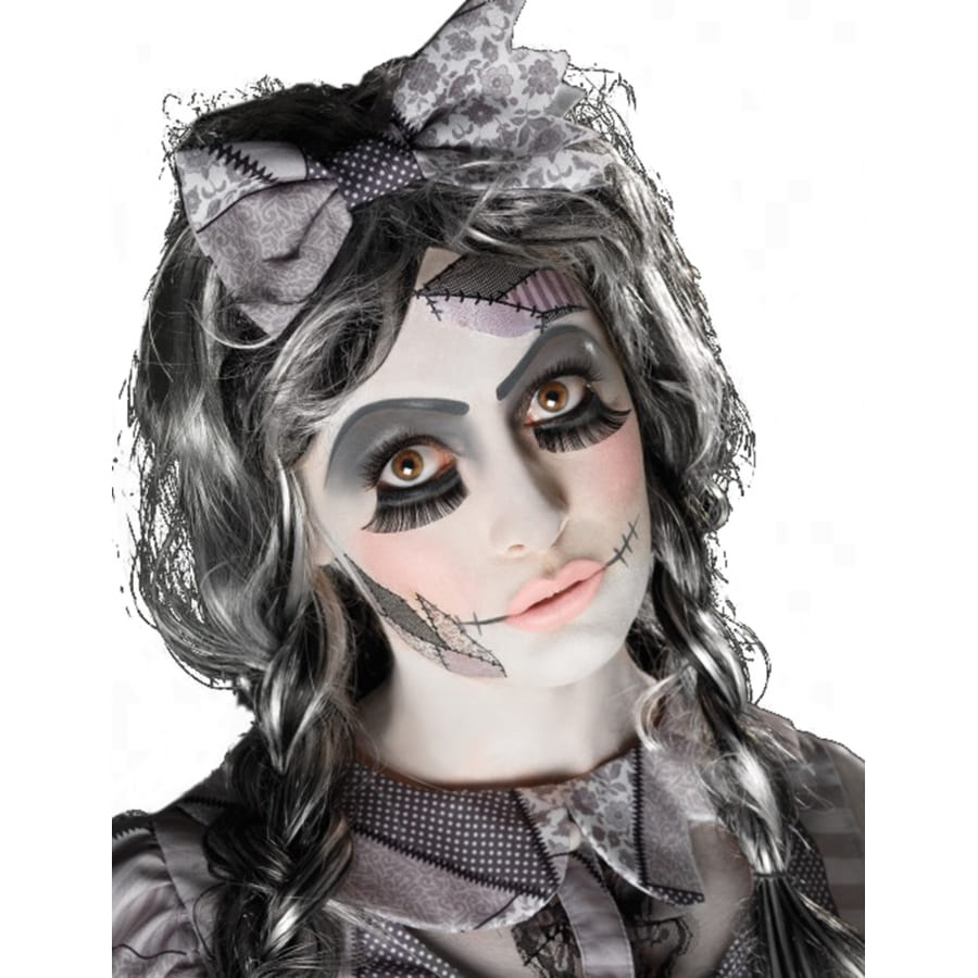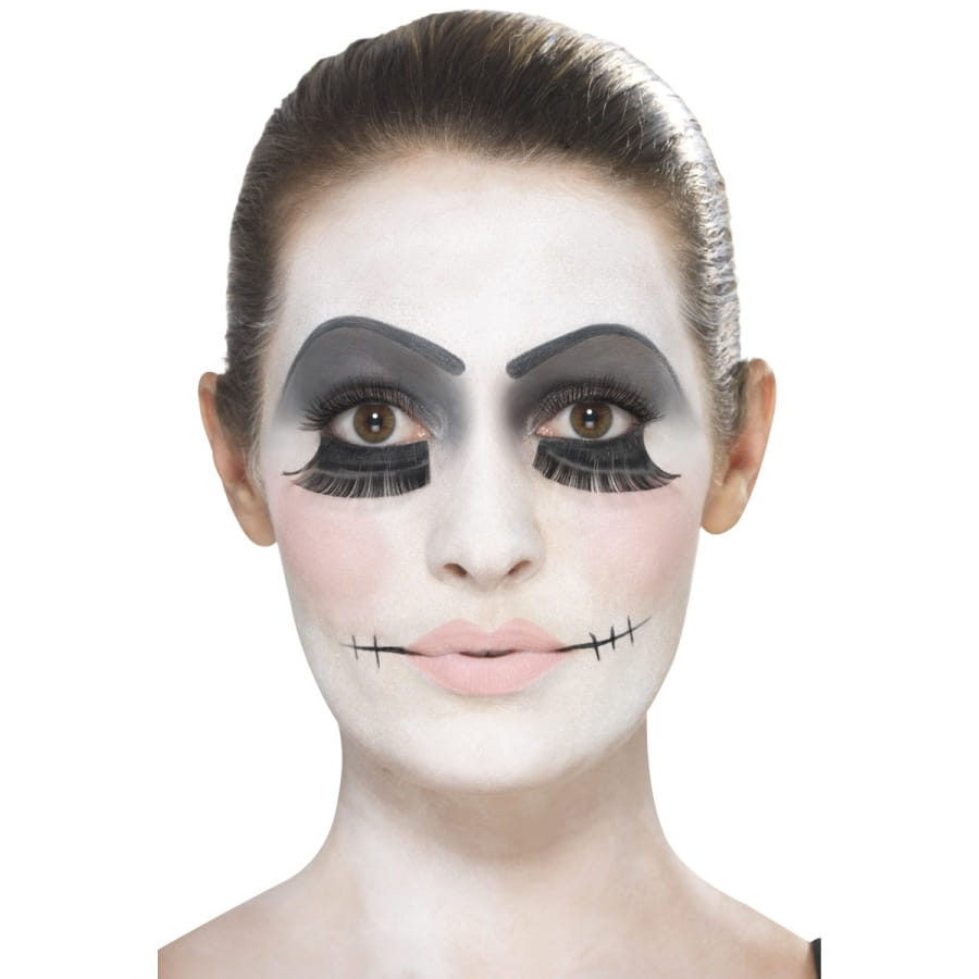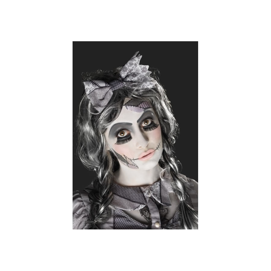 Mesdames, vous souhaitez vous déguiser en poupée de porcelaine, ce kit de maquillage peaufinera parfaitement votre tenue. Ce kit de maquillage de couleur noir contient tout ce qu'il faut afin d'améliorer votre look lors d'une soirée sous le signe de l'épouvante. Le kit est composé de maquillage noir, faux cils, décalcomanies, éponge et brosse. Suivez simplement les explications contenues dans le kit et vous obtiendrez le maquillage ici présenté en photo. La perruque n'est pas comprise dans le kit.