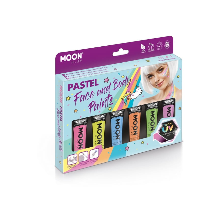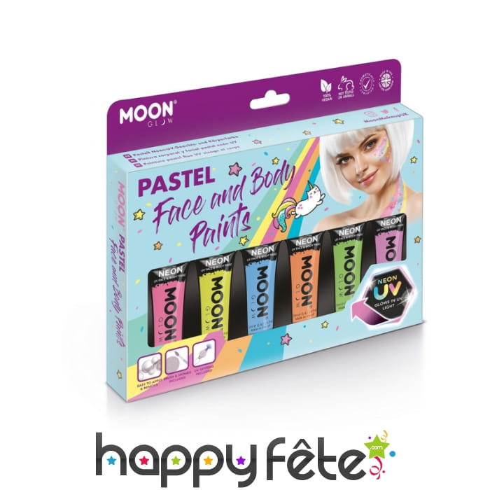 Briller de mille feux telles les couleurs de l'arc-en-ciel grâce à ce Kit maquillage UV pastel pour visage et corps.