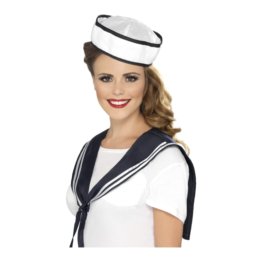 Kit de marine, pour femme, composé d'un chapeau blanc à bordure bleue et d'une écharpe avec col assortie. Déguisez-vous en jolie marine rétro avec ces accessoires pour un carnaval ou pour un enterrement de vie de garçon ou de jeune fille.
