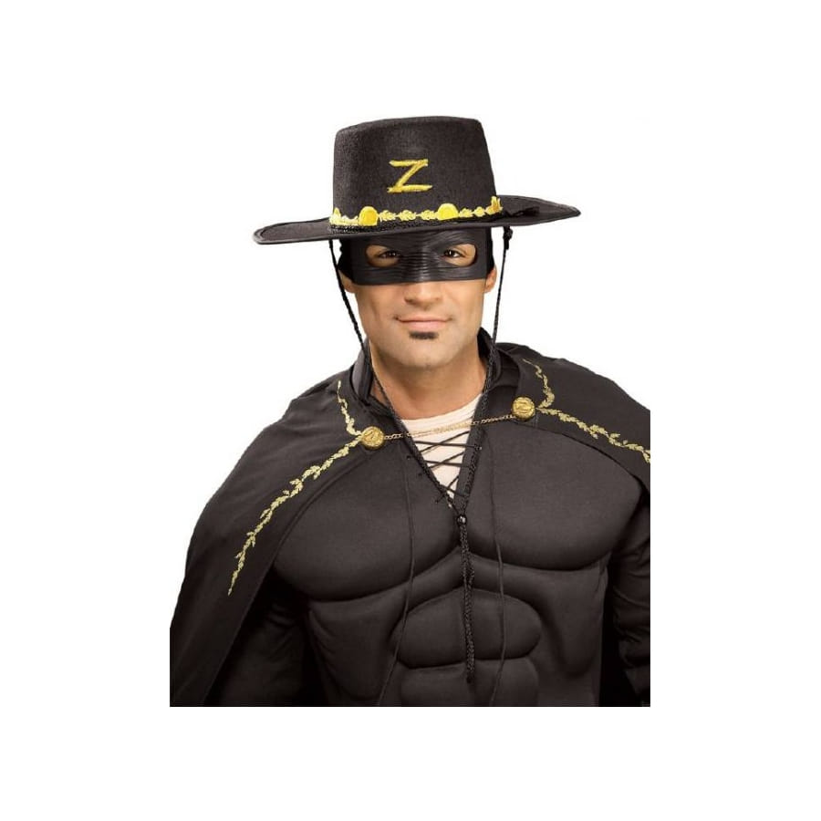 Rendu célèbre par son courage, son habileté et son grand coeur, Zorro continue de combattre les malfaiteurs pour que la justice règne. Vous aussi, n'hésitez pas à défier les malfrats en vous emparant de ce kit masque et chapeau de Zorro pour homme. Glissez dans le rôle du personnage en portant un grand chapeau de couleur noire, faisant 58 cm de tour de tête environ. L'accessoire est orné de motifs dorés à la base et d'un imprimé grand "Z" à l'avant. Le masque est noir et entoure le regard. Il est doté de deux trous pour les yeux. Il vous suffira de l'attacher à l'arrière de la tête.