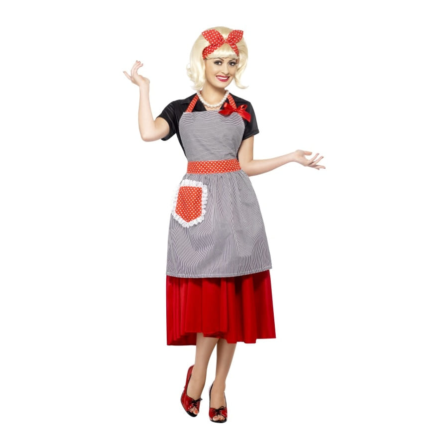 Kit de ménagère des années 50, pour femme, composé d'un tablier et d'un chapeau. Le tablier est de couleur grise, avec des attaches, une ceinture et une poche rouges à pois blancs. Le foulard qui sert de chapeau en est assorti. Le tout vous donnera l'allure des femme de ménages parfaites des années 50-60.
