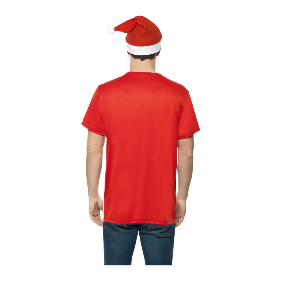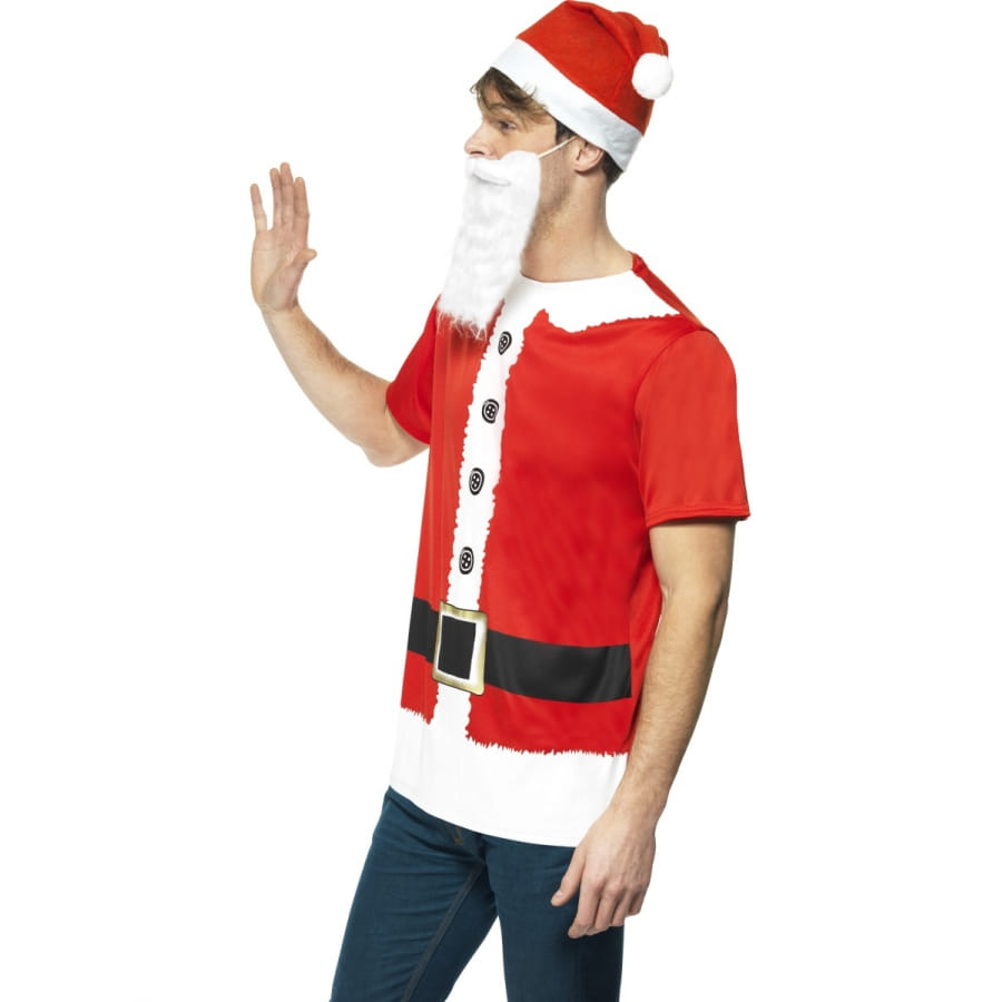 Déguisement simplifié de père noel. Contient le t-shirt aux motifs représentant un manteau de père noel, une barbe premier prix et un bonnet rouge à pompon blanc. La taille du t-shirt correspond à une taille M (correspond à une poitrine de 96/101 cm et d'un entrejambe de 83 cm).