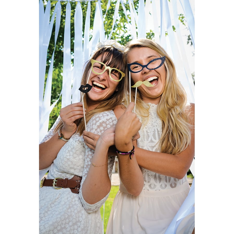 Le kit est composé d'éléments spécialement conçus pour être disposés chacun sur sa tige en bois (fournie avec le lot) et placés devant le visage lors d'une prise photo super fun.