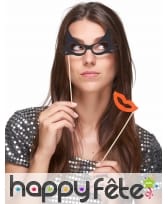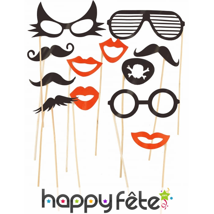 Dans ce lot vous trouverez 4 moustaches noires, 3 paires de lunettes noires (une shutter shade, une en forme de chat et une ronde), 4 bouches rouges et 1 cache-oeil de pirate noir.