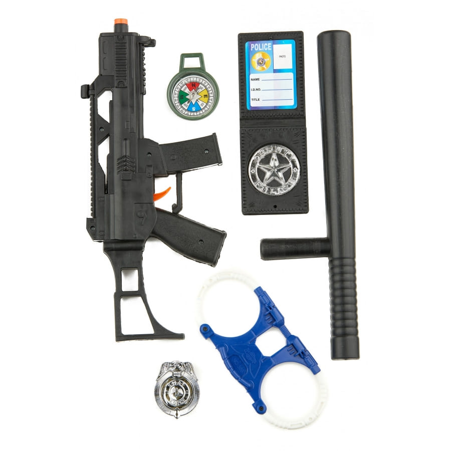 Vous trouverez dedans un pistolet de 28 cm, un portefeuille avec un insigne de police, une boussole, une matraque, un badge et une paire de menottes.