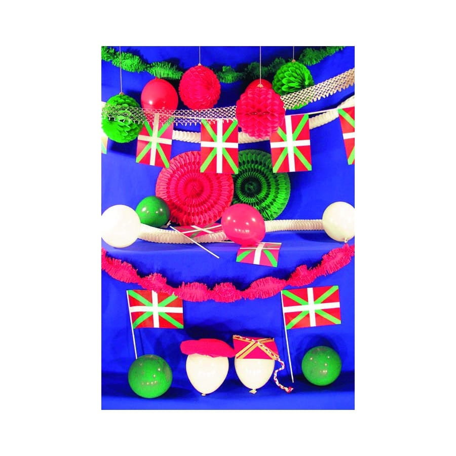 Kit régional de décoration spécial Pays Basque composé de guirlandes, d'éventails, de ballons et de drapeaux. Cet ensemble d'accessoires vous permettra d'organiser une fête basque haute en couleurs.