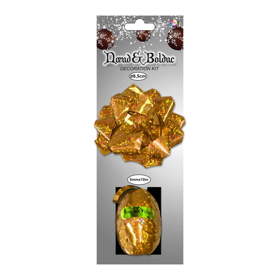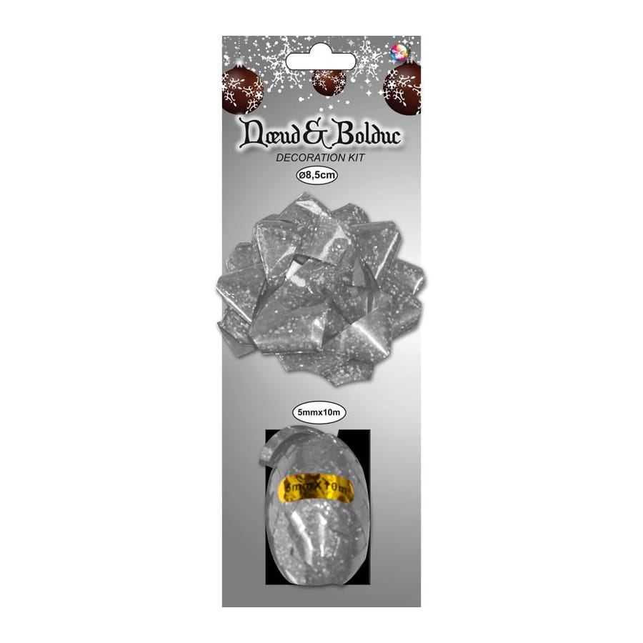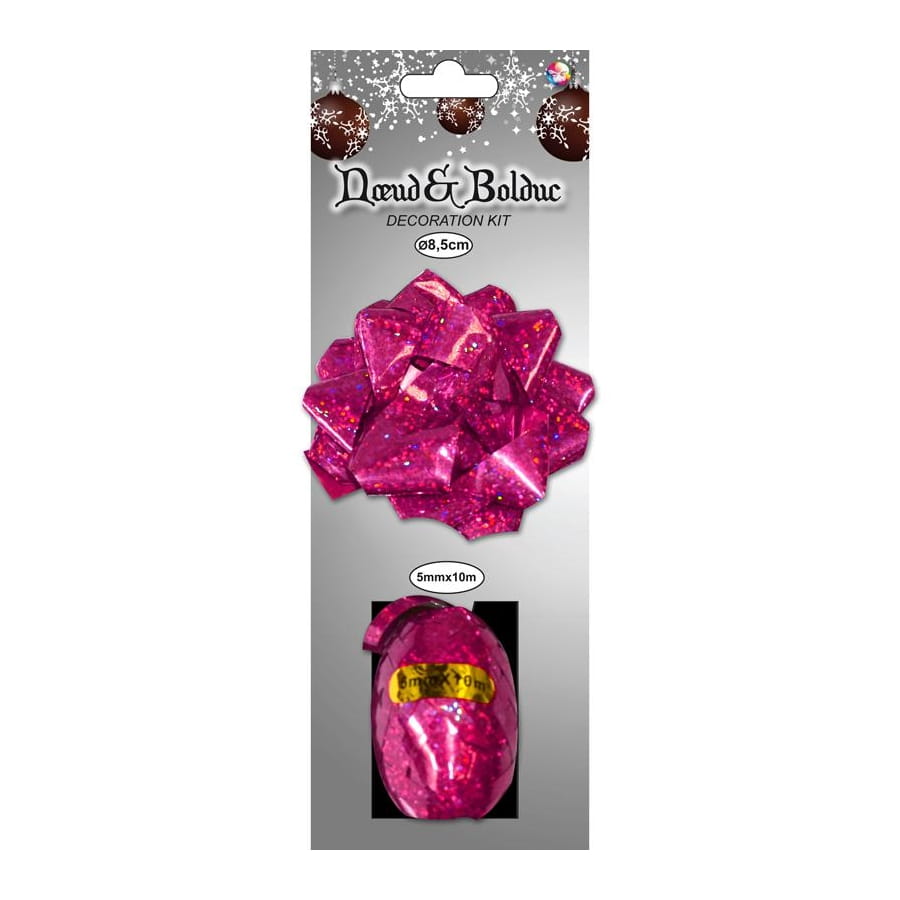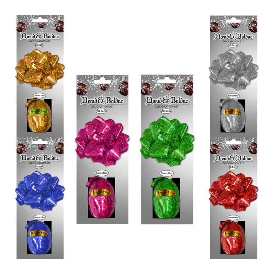 Plus besoin de chercher loin pour emballer vos cadeaux du Nouvel An ou de mariage, ce kit ruban bolduc et noeud vous sera d'un grand secours. Il est composé d'un noeud de 8,5 cm pour décorer le présent, et d'un bolduc de 5 mm x 10 m pour bien ficeler le tout. Le kit est proposé dans les coloris argent, bleu, or et bronze, rose, rouge et vert.