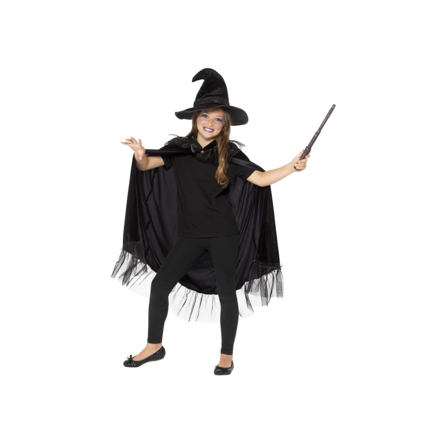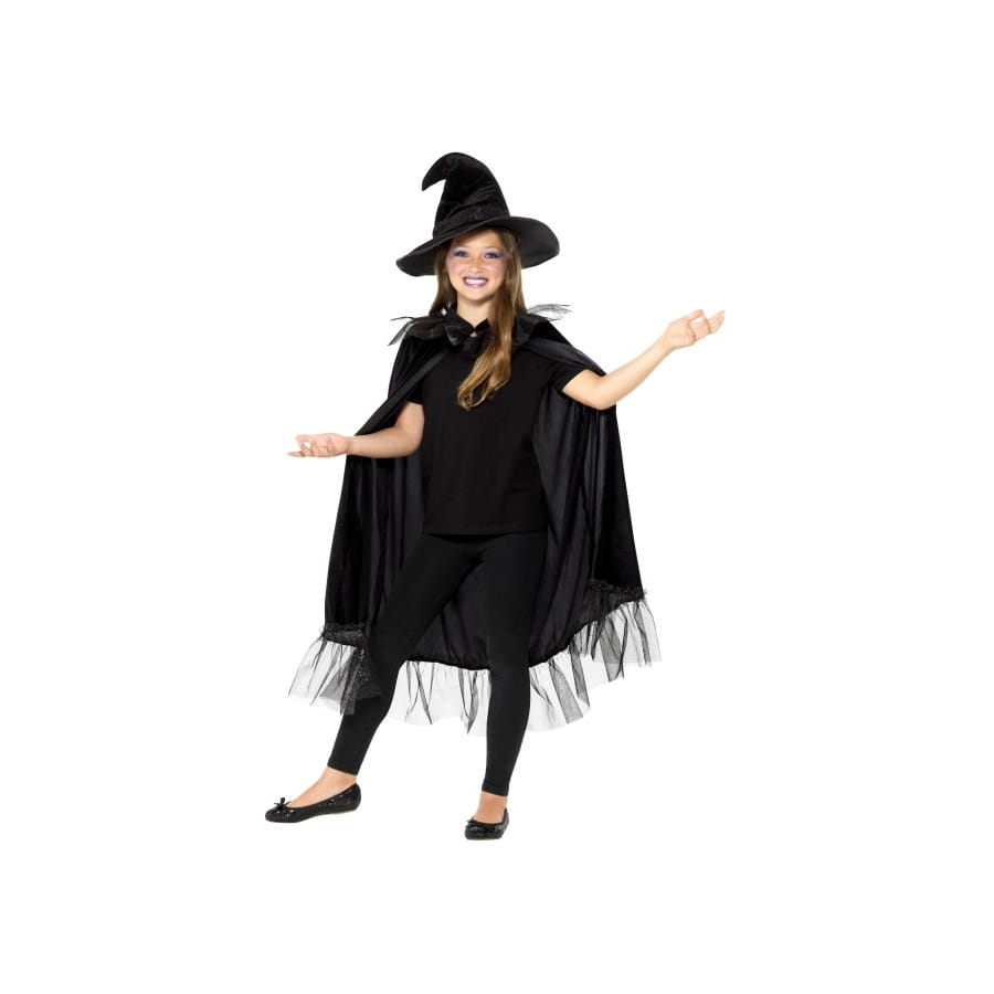 Pour un costume simple et efficace de petite sorcière, optez pour ce kit scintillant. Il s'agit d'un ensemble chapeau/cape. Les deux sont noirs unis et scintillant (non lumineux). Le bas de la cape est décoré d'une fine tulle noire.