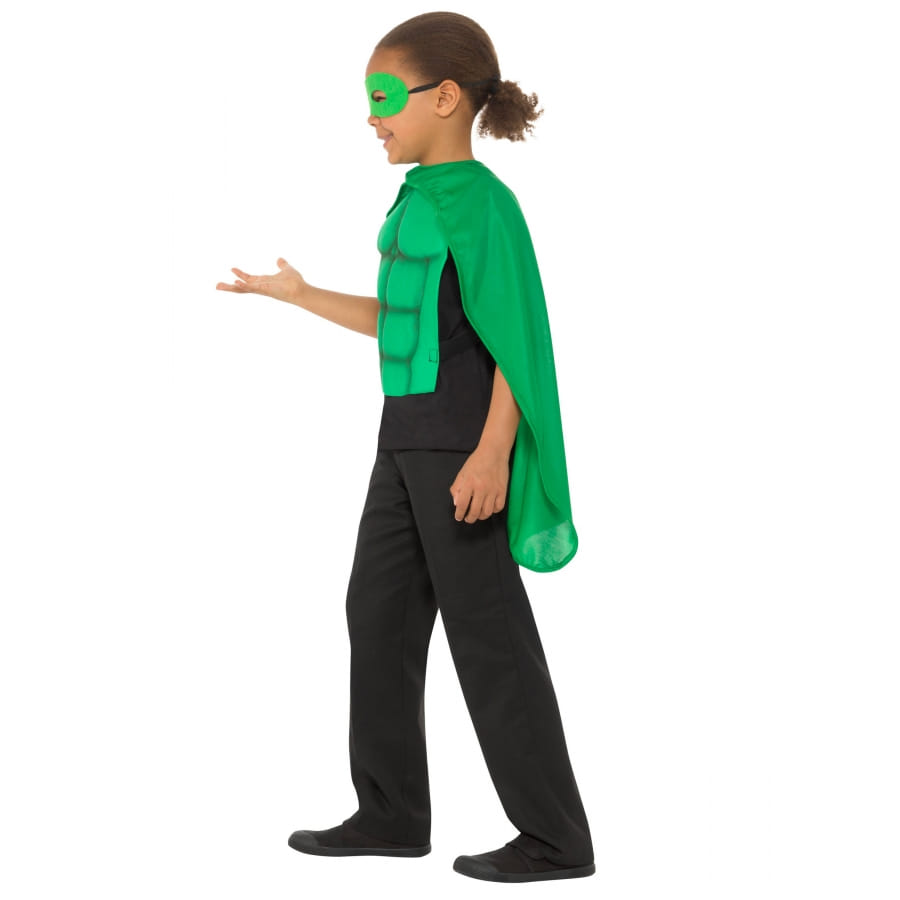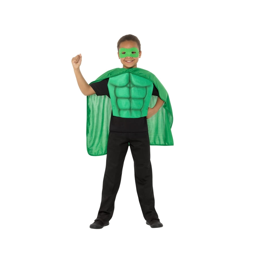 Kit vert assorti comprenant un buste en mousse EVA effet musclé, une cape ainsi qu'un masque.
