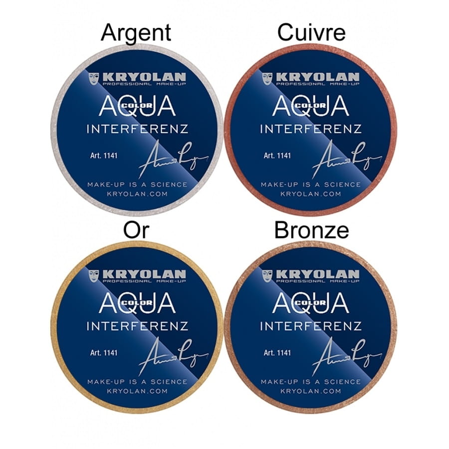 Fard à paupières à l'eau et à paillettes. Vous parviendrez à réaliser un maquillage de star ! Ce produit Aquacolor est relevé de paillettes et offre un résultat parfait à chaque utilisation. Il est disponible en deux formats : 8ml et 30ml. Décliné en différents coloris, il sublimera votre regard. Produit cosmétique interferenz de la marque Kryolan.