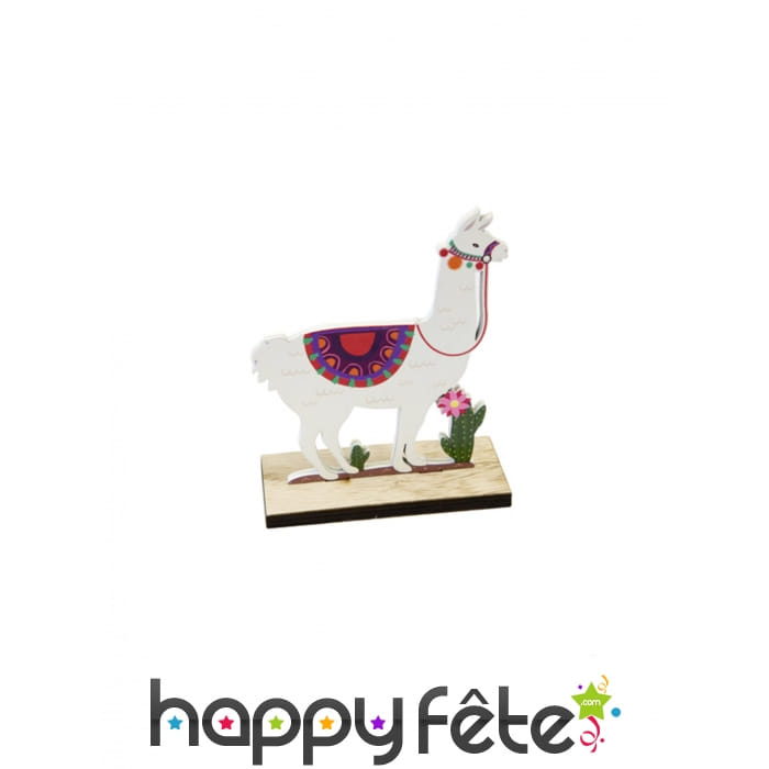 Il est question d'une décoration faite en bois, qui représente un lama se tenant debout à coté de petits cactus.