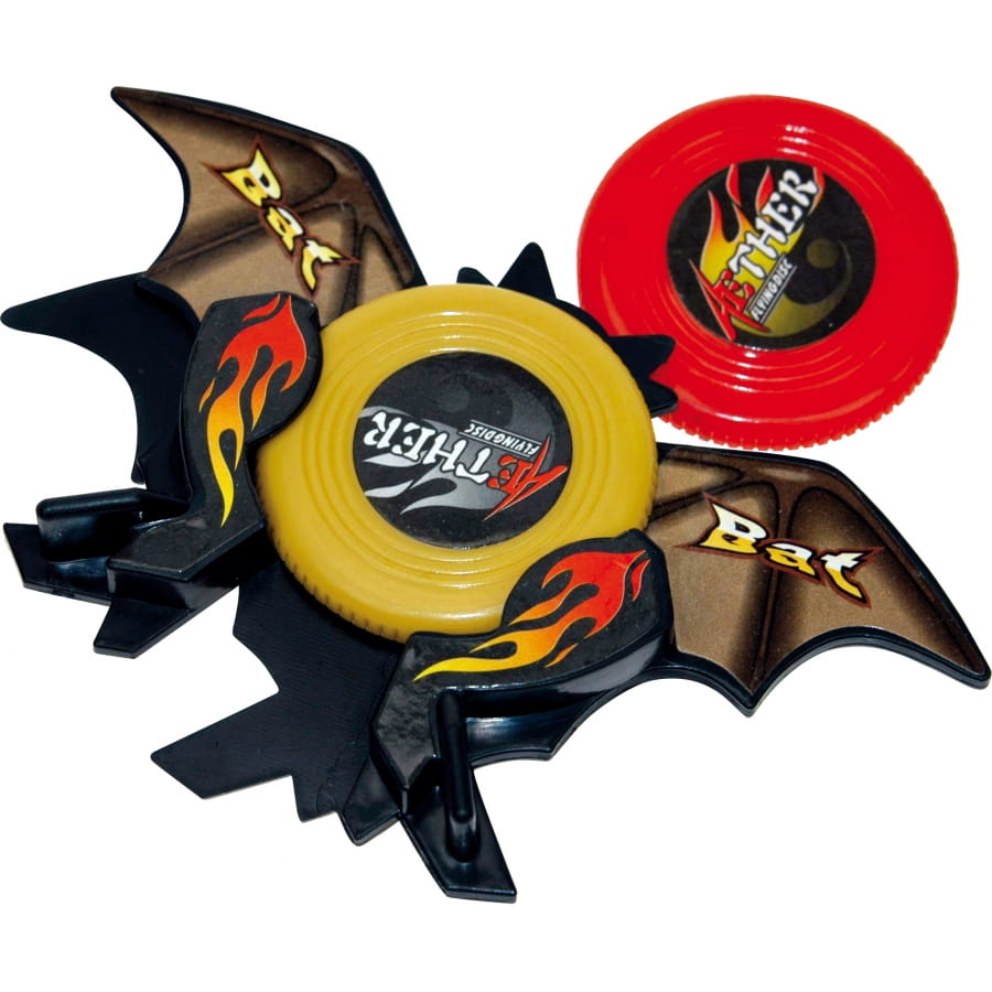 Un avion chauve souris de 9 centimètre avec lanceur de soucoupes, l'avion chauve souris de couleur noir avec des flammes sur les ailes et avec écrit dessus bat en jaune. Les soucoupes sont jaune et rouge. Pas de choix concernant la couleur ou le modèle.