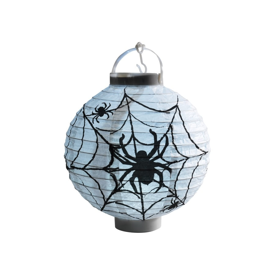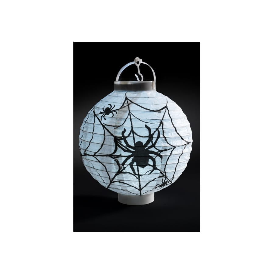 La lanterne blanche motif araignée, en papier, fait partie des objets de décorations dédiées à la fête des morts. Sa forme ronde tient en place grâce à un support à sa base et elle se suspend à l'aide d'un crochet sur le dessus. Sur cette lampe de couleur blanche se trouve des dessins d'araignées en noir, ainsi que de leur toile. Une telle lanterne fera toute la différence dans votre décoration d'halloween !