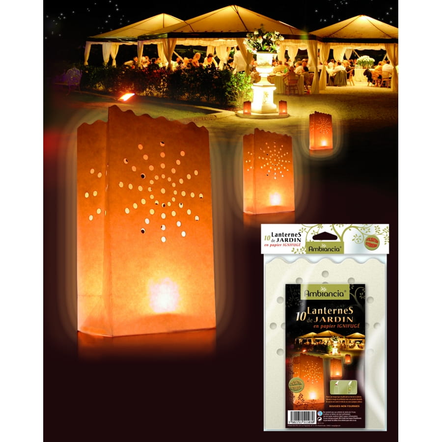 Votre jardin sera magnifique avec ces lanternes. Vous pourrez vous en servir pour une réception donner chez vous durant une soirée. Ce sachet contient 10 lanternes de jardin en papier avec un motif dessus. Il doit être utilisé avec une bougie chauffe plat qui est non incluse avec le produit.