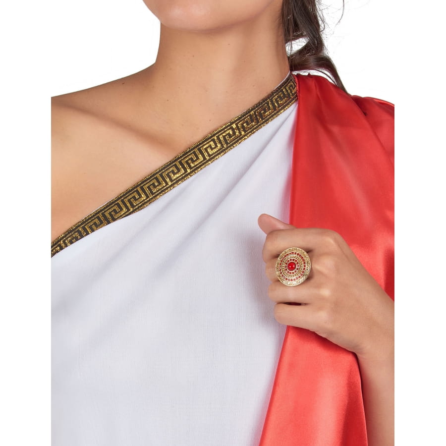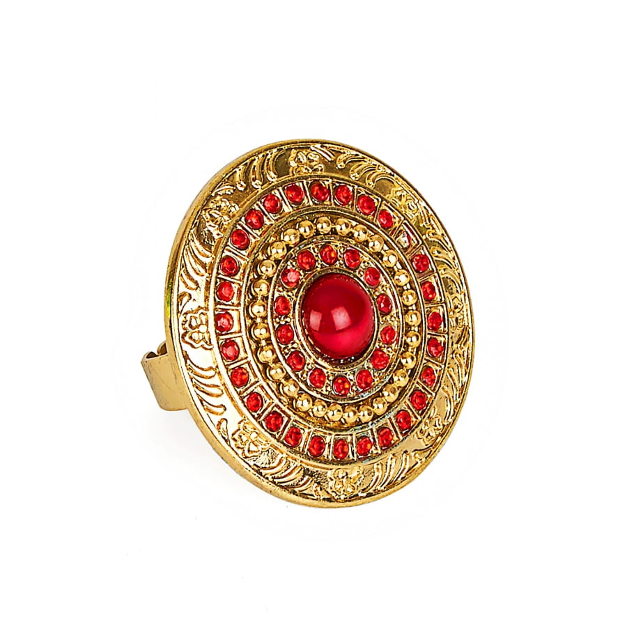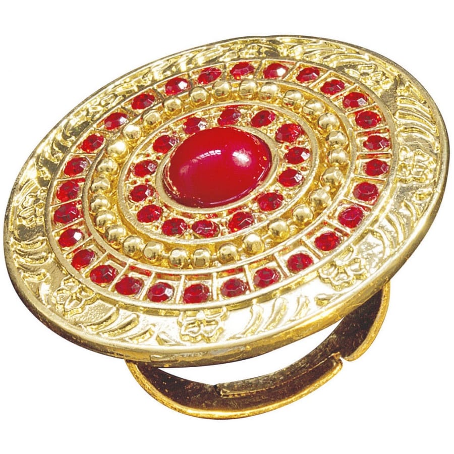 Accessoirisez votre costume antique à la façon des déesses romaines en arborant cette large bague romaine ronde dorée et rouge.