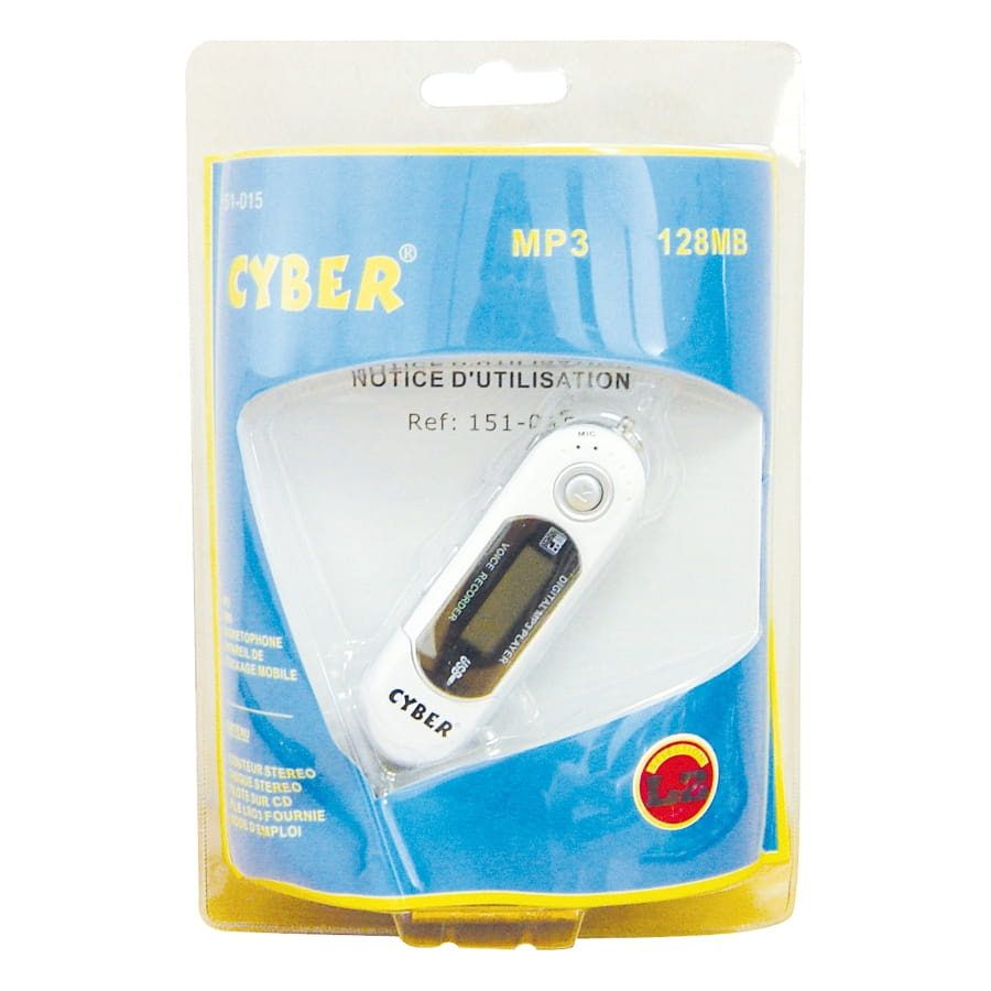 Lecteur et enregistreur MP3 de couleur blanche, de la marque Cyber. La capacité de mémoire de cet accessoire est de 128 Mo. Vous pourrez ainsi écouter votre musique partout où vous irez.