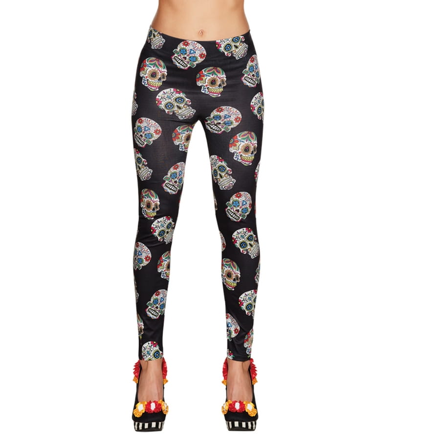 C'est un legging pour femme de couleur noire, sur lequel sont imprimés des têtes de morts décorées de fleurs et de joyaux colorés.