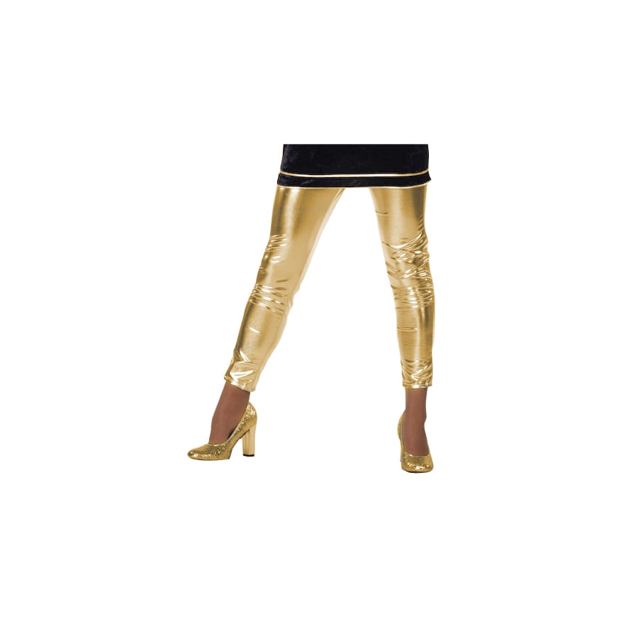 Une paire de leggings en simili doré satiné. Cet accessoire est disponible en taille 36, 38, 40, 44 ou 46. Ce leggings est parfait pour une tenue d'Halloween ou pour un déguisement futuriste.