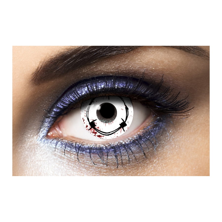 Tout est dans le regard ! Impressionnez vos amis avec des lentilles barbelés et sang. Des barbelés de couleur noire accompagnés de quelques taches de sang rouge se dessinent sur un fond blanc. Ces lentilles de contact hors du commun se marient parfaitement avec un déguisement de prisonnier. A noter que le modèle proposé est adapté aux hommes comme aux femmes.