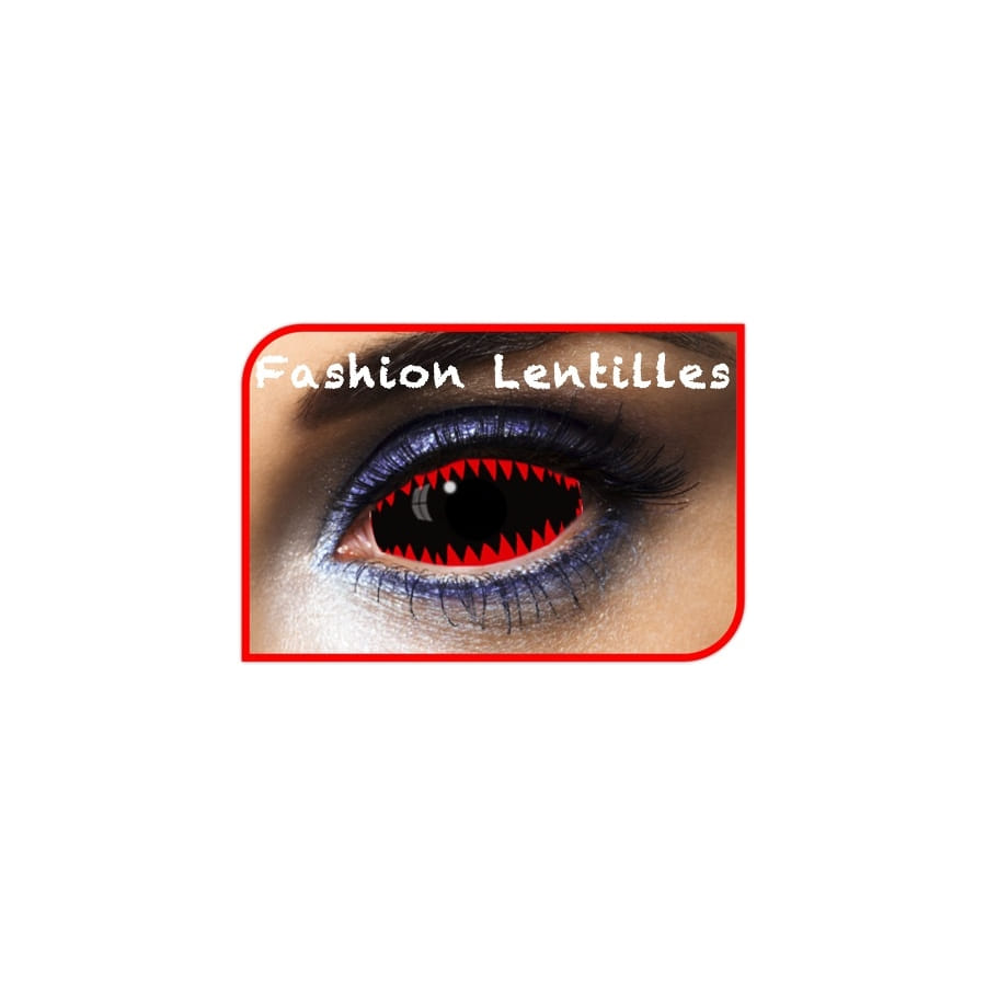 Nous nous adressons maintenant à vous, Messieurs Dames, adeptes de cette sensation extraordinaire qu'est la peur. Pour votre prochain Halloween, nous avons ce qu'il vous faut pour que vous puissiez effrayer tout le monde dans les règles de l'art. Couvrez intégralement vos yeux avec cette paire de lentilles en fond noir orné de dents de requin rouge sang. Elles sont souples et sans dioptrie. Et qui plus est, vous pourriez vous en servir pendant une année entière. Chaque lentille est vendue avec un flacon de solution saline.