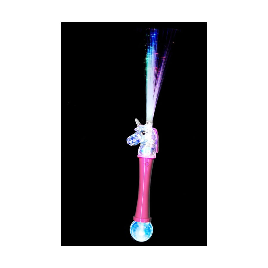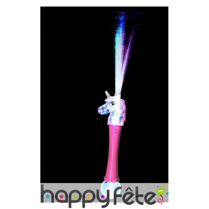Mesurant environ 41 cm, cette baguette est surmontée d'une tête de licorne brillante dotée de nombreuses fibres optiques multicolores.