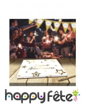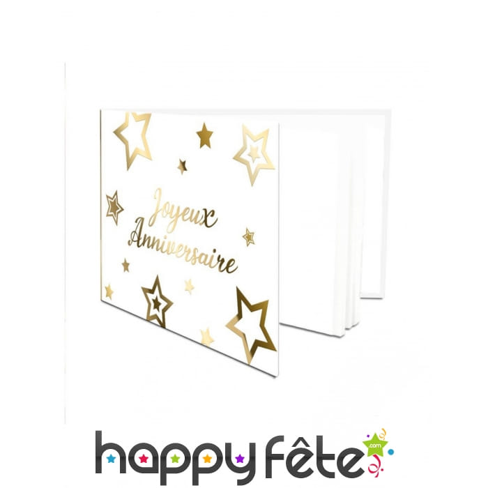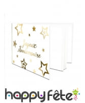 Sa couverture est blanche et présente l'inscription "joyeux anniversaire" en lettres dorées.