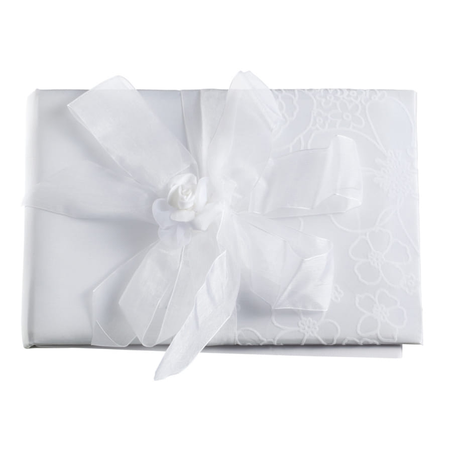 Le livre d'or est très symbolique pour les mariés. Il renferme les témoignages et les voeux des invités pour ce jour mémorable ! Nous vous conseillons ce livre d'or de mariage à la fois classique et élégant, qui va représenter à jamais vos souvenirs romantiques ! Il est de couleur blanche, enveloppé dans un fin tissu, et orné d'une magnifique fleur blanche.