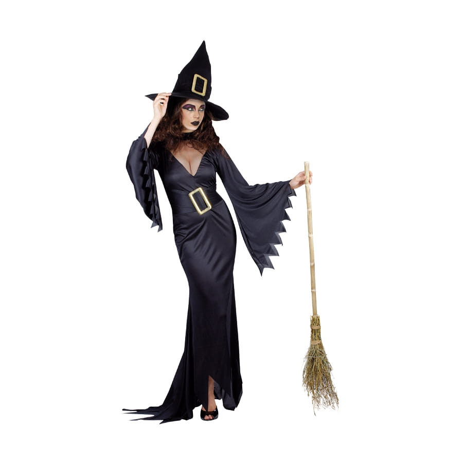 A l'école des sorcières, le cours de mode est aussi compris dans le programme. D'un coup de baguette magique, un chef d'oeuvre est né : le long costume de sorcière noire adulte. Mesdames, vous avez l'opportunité de porter cette merveille à l'occasion d'Halloween. Le costume est composé d'une longue robe décolletée et moulante, avec des manches longues et évasées. Elle est présentée dans la couleur noire. La tenue comprend aussi une large ceinture à boucle, de la même couleur que la robe. Pour finir, un chapeau pointu noir est mis à votre disposition. La section accessoires de Happyfete vous propose baguettes magiques et balais volants pour compléter au mieux ce déguisement.